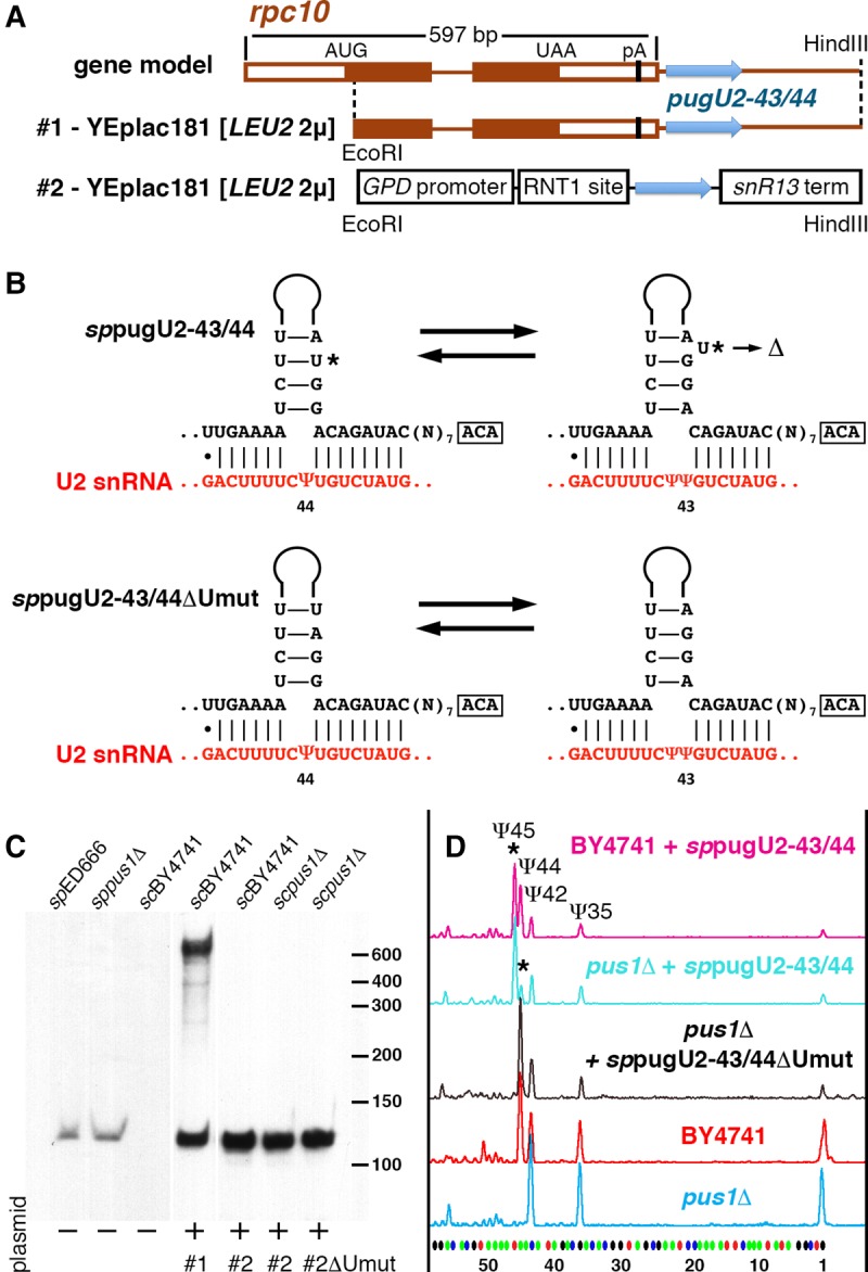 FIGURE 4. S. pombe guide RNA for U2 snRNA pseudouridylation at positions 43 and 44. (A) Scheme of the endogenous gene and expression constructs for S. pombe pugU2-43/44 RNA. (B) Predicted structural alterations and base-pairing with U2 snRNA within the 3′-terminal pseudouridylation pocket of sppugU2-43/44 RNA. Star indicates uridine in the upper stem that was deleted in the mutant variant sppugU2-43/44ΔUmut. (C) Northern blot analysis of endogenous expression of pugU2-43/44 RNA in S. pombe strains and exogenous expression from plasmids (two constructs shown in A) in S. cerevisiae. All samples were run on the same gel and probed simultaneously. The first three lanes are shown with a longer exposure than the remaining four lanes. (D) Probing the modification guide RNA activities of sppugU2-43/44 in the BY4741 wild-type and the pus1Δ mutant strains of S. cerevisiae. Stars indicate modifications that are induced by sppugU2-43/44 RNA expression.