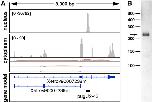 FIGURE 3. Expression of the novel Xenopus pugU2-43 RNA detected by RNA deep-sequencing of oocyte nuclear and cytoplasmic RNA (A) and by Northern blot analysis of X. tropicalis liver RNA (B). (A) IGV browser view of RNA deep-sequencing reads (PRJNA302326) previously generated in our laboratory (Talhouarne and Gall 2014) and aligned to the X. tropicalis 9.0 genome. The black bar in the gene model panel indicates pugU2-43 RNA newly identified in the nuclear fraction.