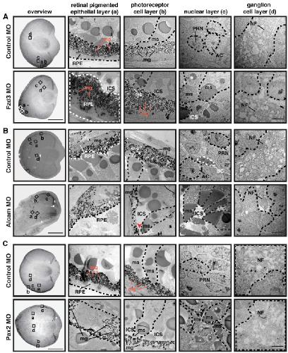 Loss of Fzd3 as well as Alcam leads to defects in retinal lamination and cell adhesion. Transmission electron microscopy of Control MO (A-C, upper rows), Fzd3 MO (A, lower row), Alcam MO (B, lower row) and Pax2 MO (C, lower row) injected Xenopus eyes at stage 42. Specific cells are highlighted by dotted circles. Overview: Overviews of the eyes including the location of close-ups in the retinal pigmented epithelial layer (a), photoreceptor cell layer (b), nuclear layer (c) and ganglion cell layer (d). Scale bar: 100 µm. Retinal pigmented epithelial layer (a): Fzd3, Alcam or Pax2 deficient eyes show thicker RPE layers. Photoreceptor cell layer (b): In Control MO injected embryos, the photoreceptor cell layer mainly includes photoreceptor cells, which are embedded in the retinal-pigmented epithelium (RPE). RPE cells contain melanin granuli (mg), photoreceptors specific membrane stacks (ms). Selected photoreceptor cells are highlighted by dotted circles. Upon Fzd3, Alcam or Pax2 depletion, intercellular spaces (ICS) are increased leading to detachment of photoreceptors (red arrowhead). Nuclear layer (c): The natural nuclear cell layer (NCL) of Control MO injected eyes is characterized by retina-specific cell nuclei such as nuclei of bipolar (BC), amacrine (AC) and photoreceptor cells (PRN). In contrast, the NCL of Fzd3, Alcam and Pax2 morphants was disorganized by the formation of rosette-like structures characterized by membrane stacks (ms) indicating ectopic photoreceptor cells. Moreover, Fzd3 and Alcam MO injection leads to an increase of intercellular spaces (ICS), an indication for cell adhesion defects. Ganglion cell layer (d): Ganglions are normally differentiated in Control, Fzd3, Alcam or Pax2 MO injected retinas. Scale bar: 5000 nm. Abbreviations: AC, amacrine cell; BC, bipolar cell; ICS, intercellular space; NF, neuronal fiber; RPE, retinal pigmented epithelium; mg, melanin granula; ms, membrane stacks; PRN, photoreceptor nucleus. Number of embryos analyzed by TEM: Control MO, 9; Fzd3 MO, 4; Alcam MO, 4; Pax2 MO, 4.