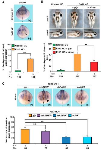 Fzd3 regulates alcam expression during eye development through JNK1. A. After injection of Fzd3 MO, alcam expression in the eye region was significantly reduced on the injected side of the embryo (black arrow) at stage 21 as shown by WMISH. A quantitative representation is given. B. The eye phenotype upon loss of Fzd3 could be reverted by co-injection of alcam RNA. A quantitative representation is given. C. Loss of Fzd3 led to a downregulation of alcam expression in the eye anlage at stage 20 (black arrow). Co-injection of dshδDEP mRNA could not rescue the phenotype (black arrow), whereas co-injection of dshδDIX or caJNK1 mRNA could significantly restore the alcam expression upon Fzd3 depletion. Abbreviations: inj., injected; n, number of independent experiments; N, total number of analyzed embryos; n.s., not significant. Error bars indicate the standard error of the mean (s.e.m.); n.s., not significant pâ¥0.05, * pâ¤0.05, ** pâ¤0.01. p values were calculated by a non-parametric Mann-Whitney rank sum test.
