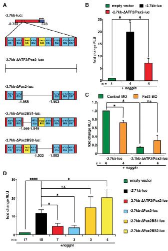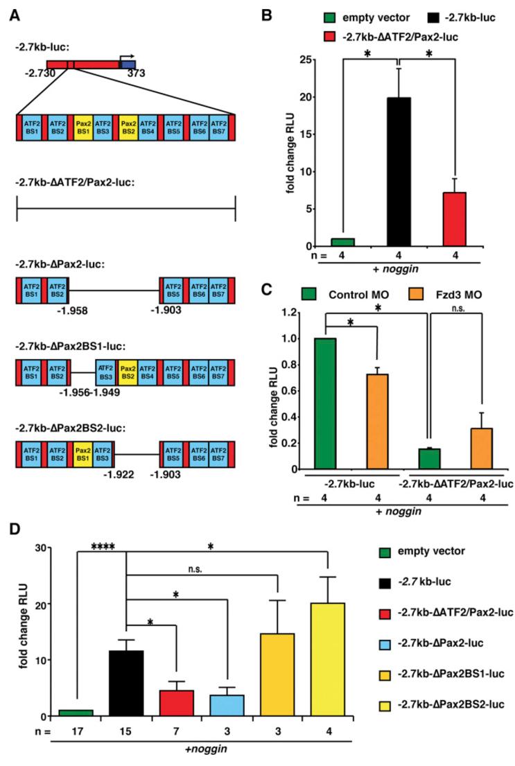 One Pax2 binding site is sufficient to activatealcampromoter activity in neural animal caps. A. A schematic drawing of different deletion constructs of the alcam promoter region. In the native promoter region, seven ATF2 binding sites (blue) and two Pax2 binding sites (yellow) were found. The different regulatory alcam promoter regions were cloned in front of the luciferase reporter gene. See Fig. S4 for more details. B. Promoter activity of different alcam promoter constructs in neuralized animal caps by co-injection of 600 pg noggin mRNA. C. Loss of Fzd3 led to a reduction of the promoter activity of â2.7kb-luc, whereas â2.7kb-âATF2/Pax2-luc was not sensitive to a reduction of Fzd3. D. Promoter activity of different promoter constructs as illustrated in A. in neuralized animal caps. Alcam promoter activity was lost in the absence of both Pax2 binding sites (blue bar). Alcam promoter activity was rescued by the presence of at least one Pax2 binding site (yellow bars). Abbreviations: n, number of independent experiment; n.s., not significant; RLU, relative light units. Error bars indicate standard error of the mean (s.e.m.); * pâ¤0.05. p values were calculated by a non-parametric MannâWhitney rank sum test.