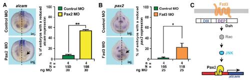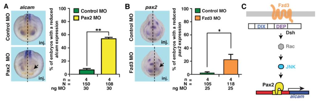 Fzd3 and Pax2 are upstream ofalcam. A. After injection of Pax2 MO, alcam expression was reduced on the injected side of the embryo at stage 21 (black arrow). A quantitative representation is given. B. After injection of Fzd3 MO, pax2 expression was mildly, but significantly reduced on the injected side of the embryo at stage 21 (black arrow). C. Schematic drawing. Fzd3 regulates alcam expression via the β-catenin independent Wnt/JNK pathway and Pax2. Abbreviations: n, number of independent experiment; N, total number of analyzed embryos. Error bars indicate standard error of the mean (s.e.m.); ** pâ¤0.01. p values were calculated by a non-parametric MannâWhitney rank sum test.