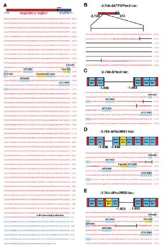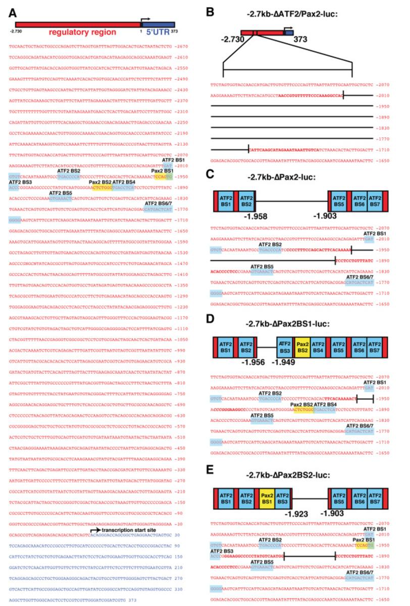 Sequence of the alcam regulatory region and deletion constructs. A. â2.7kb regulatory promoter region (red) and 5â²UTR region (blue) of alcam. AP1/ATF2 binding sites are indicated by blue boxes, Pax2 binding sites by yellow boxes. B.-E. Different deletion constructs are shown as insets of the alcam regulatory region. AP1/ATF2 binding sites are indicated by blue boxes, Pax2 binding sites by yellow boxes, deletion sites by black strokes. B. â2.7kb-âATF2/Pax2-luc promoter construct lacking a 265 bp long region containing seven AP1/ATF2 binding sites and two Pax2 sites. C. â2.7kb-âPax2-luc promoter construct lacking 55 bp that contains both Pax2 binding sites and ATF2 binding sites 3 and 4. D. â2.7kb-âPax2BS1-luc promoter construct lacking 6 bp, covering the Pax2 binding site 1. E. â2.7kb-âPax2BS2-luc promoter construct lacking a 20 bp long region, containing the Pax2 binding site 2 as well as the ATF2 binding site 4.