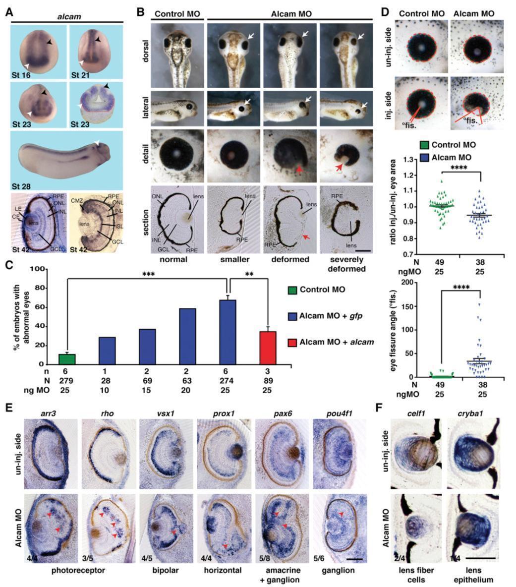 Alcam deficiency results in abnormal eye development. A. The spatial expression pattern of alcam by WMISH shows alcam expression in the developing eye (white arrowheads) and the neural tube (black arrowheads) at indicated stages. At stage 42, alcam RNA was predominantly found in the ganglion cell layer (lower left panel), the lens epithelium (LE) and the cornea epithelium (CE) as shown by WMISH. Antibody staining demonstrated that the Alcam protein is mainly localized in the ciliary marginal zone (CMZ) and inner synaptic and nuclear layer of the retina (lower right panel). B. Loss of Alcam led to smaller and deformed eyes on the injected side (white arrows) in comparison to the un-injected side or Control MO injected embryos. Furthermore, Alcam depletion results in a disorganized retinal lamination as well as absent RPE (red arrows). Representative embryos are shown. Scale bar (sections): 100 µm. C. Quantitative representation of the data shown in B. Loss of Alcam led to disturbed eye morphology in a MO-dose dependent manner. Co-injection of alcam RNA significantly rescued the Alcam MO-induced eye phenotype. D. Detailed views of Control MO and Alcam MO injected embryos. Dashed red lines indicate measured eye areas. Red lines indicate the eye fissure angle (°fis.) measured. Quantitative representations of eye area and eye fissure angle (°fis.) measurements are given. E. Cross sections of Alcam-depleted embryos after WMISH. In contrast to the un-injected side, loss of Alcam led to a disorganization of the retinal cell layers due to ectopic formation of rosette-like structures of photoreceptor cells (red arrowheads). The ratios of Alcam MO injected embryos showing retinal lamination defects versus all investigated embryos are indicated in each marker gene picture respectively. Scale bar: 100 µm. F. Lens specific markers celf1 and cryba1 are shown by WMISH. Marker gene expression was unaffected upon Alcam depletion although some lenses were smaller (the ratios of Alcam MO injected embryos showing smaller lenses versus all investigated embryos are indicated). Scale bar: 100 µm. Abbreviations: CE, cornea epithelium; CMZ, ciliary marginal zone; GCL, ganglion cell layer; INL, inner nuclear layer; inj., injected; ISL, inner synaptic layer; LE, lens epithelium; n, number of independent experiments; N, total number of analyzed embryos; ONL, outer nuclear layer; RPE, retinal pigmented epithelium; st, stage. Error bars indicate standard error of the mean (s.e.m.). ** pâ¤0.01, *** pâ¤0.001, **** pâ¤0.0001. p values were calculated by non-parametric MannâWhitney rank sum test.
