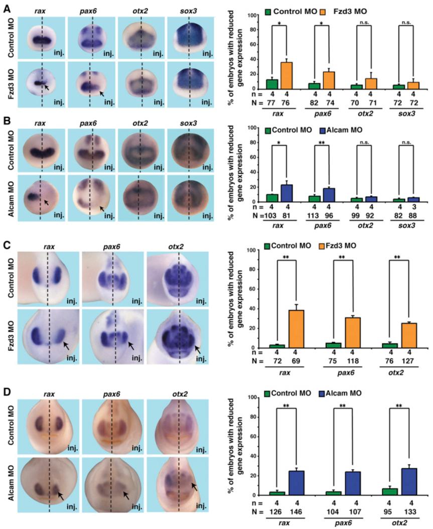 Eye marker gene expression upon Fzd3 and Alcam deficiency. After depletion of Fzd3 (A) or Alcam (B), rax and pax6 expression in the eye field was slightly but significantly reduced at stage 13 compared to Control MO injected sides as shown by WMISH. In contrast, otx2 and sox3 were unaffected upon Alcam or Fzd3 MO injection. At stage 23, expression of rax, pax6, and otx2 in the eye region was reduced after loss of either Fzd3 (C) or Alcam (D) in comparison to Control MO injected embryos. Quantitative representations are given. Abbreviations: inj., injected; n, number of independent experiments; N, total number of analyzed embryos; n.s., not significant. Error bars indicate standard error of the mean (s.e.m.). * pâ¤0.05, ** pâ¤0.01. p values were calculated by a non-parametric MannâWhitney rank sum test.