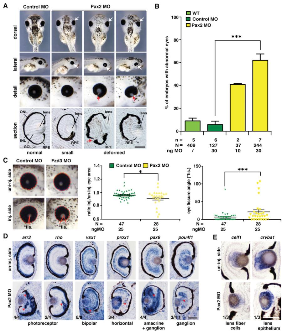 Loss of Pax2 phenocopies loss of Alcam and Fzd3. A. Loss of Pax2 led to smaller and deformed eyes on the injected side (white arrows) in comparison to the un-injected or Control MO side. Pax2 inhibition resulted in a disturbed retinal pigmented epithelium (RPE, red arrows). Representative embryos are shown. Scale bar (sections): 100 µm. B. Quantitative representation of the data shown in A is given. C. Detailed views of Control MO and Pax2 MO injected embryos. Dashed red lines indicate measured eye areas. Red lines indicate the eye fissure angles (°fis.) measured. Quantitative representation of eye area and eye fissure angle (°fis.) measurements are demonstrated. D. Transversal vibratome sections of Pax2 depleted embryos after WMISH with markers for different retinal cell types. Loss of Pax2 led to disorganized retinal cell layers by the formation of rosette-like structures by ectopic photoreceptor cells (red arrowheads). Ratios of Fzd3 MO injected embryos showing retinal lamination defects versus all investigated embryos are indicated in marker gene pictures respectively. Scale bar: 100 µm. E. Lens specific markers celf1 and cryba1 are shown by WMISH. Marker gene expression was unaffected upon Fzd3 depletion although some lenses were smaller (the ratios of Fzd3 MO injected embryos showing smaller lenses versus all investigated embryos are indicated). Scale bar: 100 µm. Abbreviations: GCL, ganglion cell layer; INL, inner nuclear cell layer; n, number of independent experiments; N, total number of analyzed embryos; ONL, outer nuclear cell layer. Error bars indicate standard error of the mean (s.e.m.); ** pâ¤0.01, *** pâ¤0.001. p values were calculated by a non-parametric MannâWhitney rank sum test.