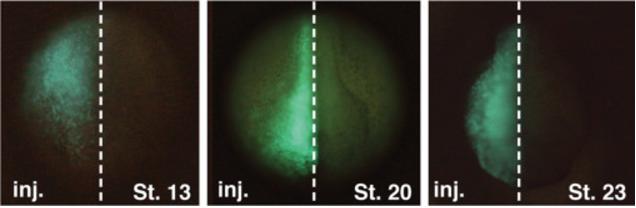 gfp fluorescence of neural tissue in Xenopus laevis. GFP fluorescence of Xenopus laevis embryos at stage 13, 20, and 23, respectively, after injection of gfp mRNA as well as antisense morpholino oligonucleotide into one of the animal dorsal blastomeres at 8-cell stage.