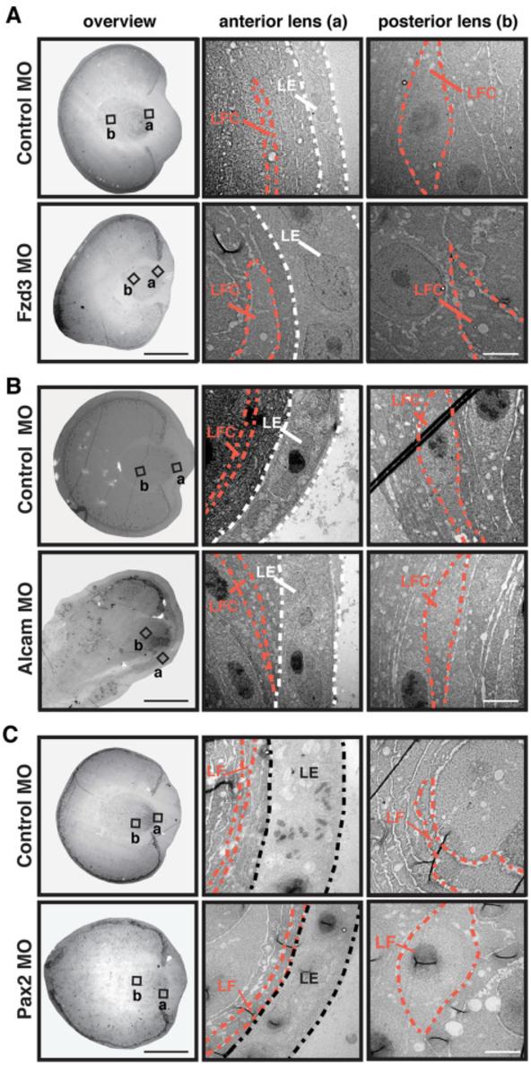 Lens cells are not affected upon loss of Fzd3, Alcam or Pax2. Transmission electron microscopy was used to examine lens and inner retina layers upon Fzd3 (A), Alcam (B) and Pax2 (C) depletion at embryonic stage 42, respectively. Specific cells are highlighted by dotted circles. Overview: A. Overview of the eyes including the location of close-ups in the anterior lens (a), posterior lens (b) and the ganglion cell layer (c). Scale bar: 100 µm. Specific cells are highlighted by dotted circles. Anterior und posterior lens (a, b): Neither the anterior, nor the posterior parts of the lens show a phenotype upon Fzd3, Alcam or Pax2 depletion. Scale bar: 5000 nm. Abbreviations: LE, lens epithelium; LFC, lens fiber cell. Number of embryos analyzed by TEM: Control MO, 9; Fzd3 MO, 4; Alcam MO, 4; Pax2 MO, 4.