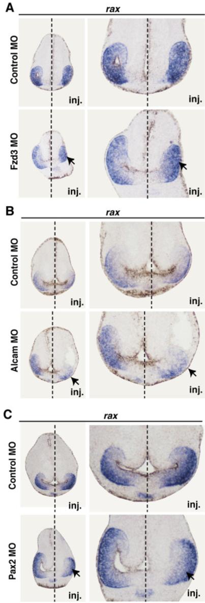 Eye vesicle formation is disturbed following Fzd3, Alcam or Pax2 depletion. A. Transversal sections of Control MO and Fzd3 MO injected embryos stained with rax by WMISH at stage 23/24. The optic vesicle is smaller in the Fzd3 MO injected side (black arrow) of the embryo when compared to un-injected side or Control MO injected embryos. B. Transversal sections of Control MO and Alcam MO injected embryos stained with rax by WMISH at stage 23/24. The optic vesicle is smaller in the Alcam MO injected side (black arrow) of the embryo when compared to un-injected side or Control MO injected embryos. Note that the rax expression intensity is reduced at the Alcam MO injected side. C. Transversal sections of Control MO and Pax2 MO injected embryos stained with rax by WMISH at stage 23/24. The optic vesicle is smaller in the Pax2 MO injected side (black arrow) of the embryo when compared to the un-injected side or to Control MO injected embryos. Abbreviation: inj., injected.