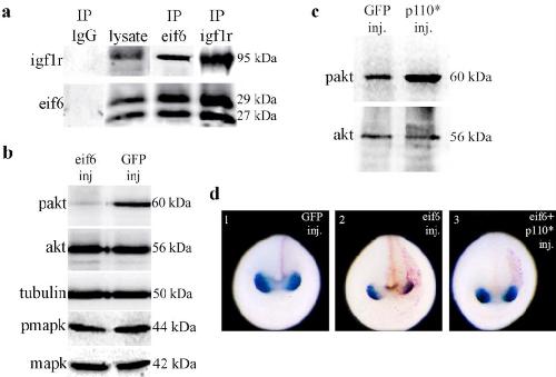 eif6 interaction with the igf pathway. a. Co-immunoprecipitation using anti-eIF6 or anti-IGFR. The two isoforms of eif6 are immunoprecipitated by anti-IGFR and igfr is immunoprecipitated by anti-eIF6, in contrast to the control immunoprecipitation using IgG. b. Immunoblots of eif6-injected embryos or of GFP-injected embryos. Anti-AKT or anti-pAKT, as well as anti-pMAPK or anti-MAPK, were used: there is a clear decrease in pakt level in eif6-injected embryos compared to GFP-injected embryos. In contrast, in embryos injected with eif6 or with GFP no difference is observed between pmapk and mapK levels. Normalization was performed with anti-tubulin. c. Animal caps lysates of embryos injected with p110* of the PI3 kinase were analyzed. pAkt level is higher in embryos injected with p110* than in those injected with GFP. d.In situ hybridizations of neurula embryos using rax1 riboprobe. The hybridization by this marker specific for the eye indicates the extension of the eye field in the observed embryos. 1. Control embryos injected with GFP showing that the rax1 hybridization extension is practically identical in both sides of the embryo. 2. The side of the embryo injected with eif6 shows a rax1 hybridization less extended than the un-injected side. 3. In the embryo side co-injected with p110* and eif6 the eye field stained by rax1 is practically identical in both sides of the embryo indicating that a partial rescue of the eye field occurs in these embryos. Rescue means a partial or total recovery of the hybridization extension as found in the eye-field of the embryo un-injected side. βgal mRNA was visualized with Red-Gal.