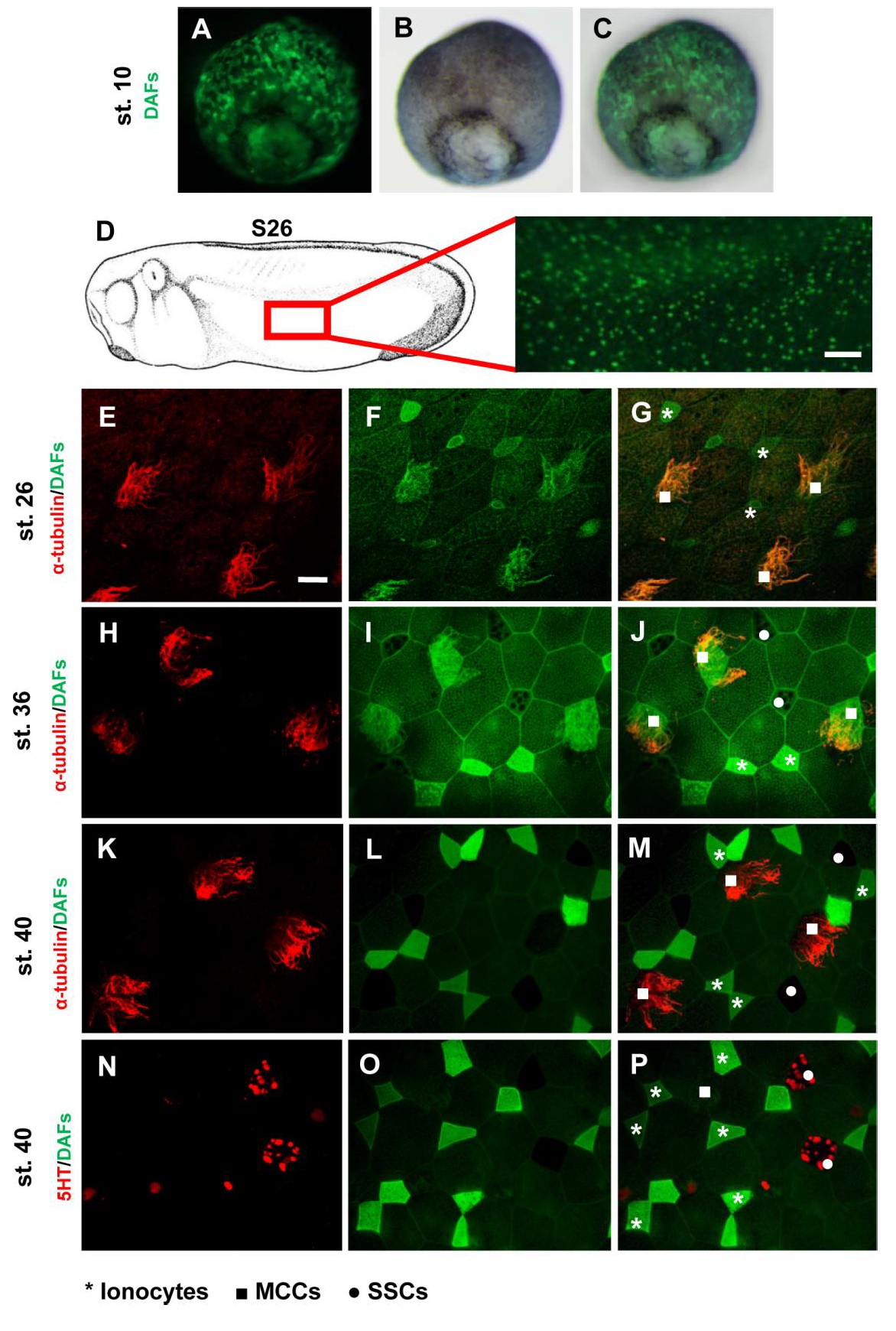 was made in early developmental stages (stage 10) (A-C). Double staining with DAFs (NO) and anti-alpha tubulin (MCCs) at