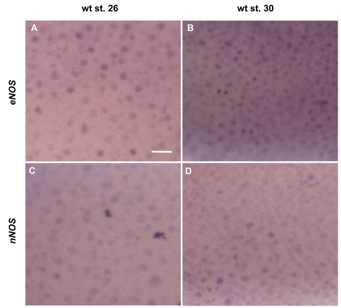 Embryos were hybridised with probes against eNOS (A,B) and nNOS (B,D) at stage 26 (A,C) and 30 (B,D). Positive cells on