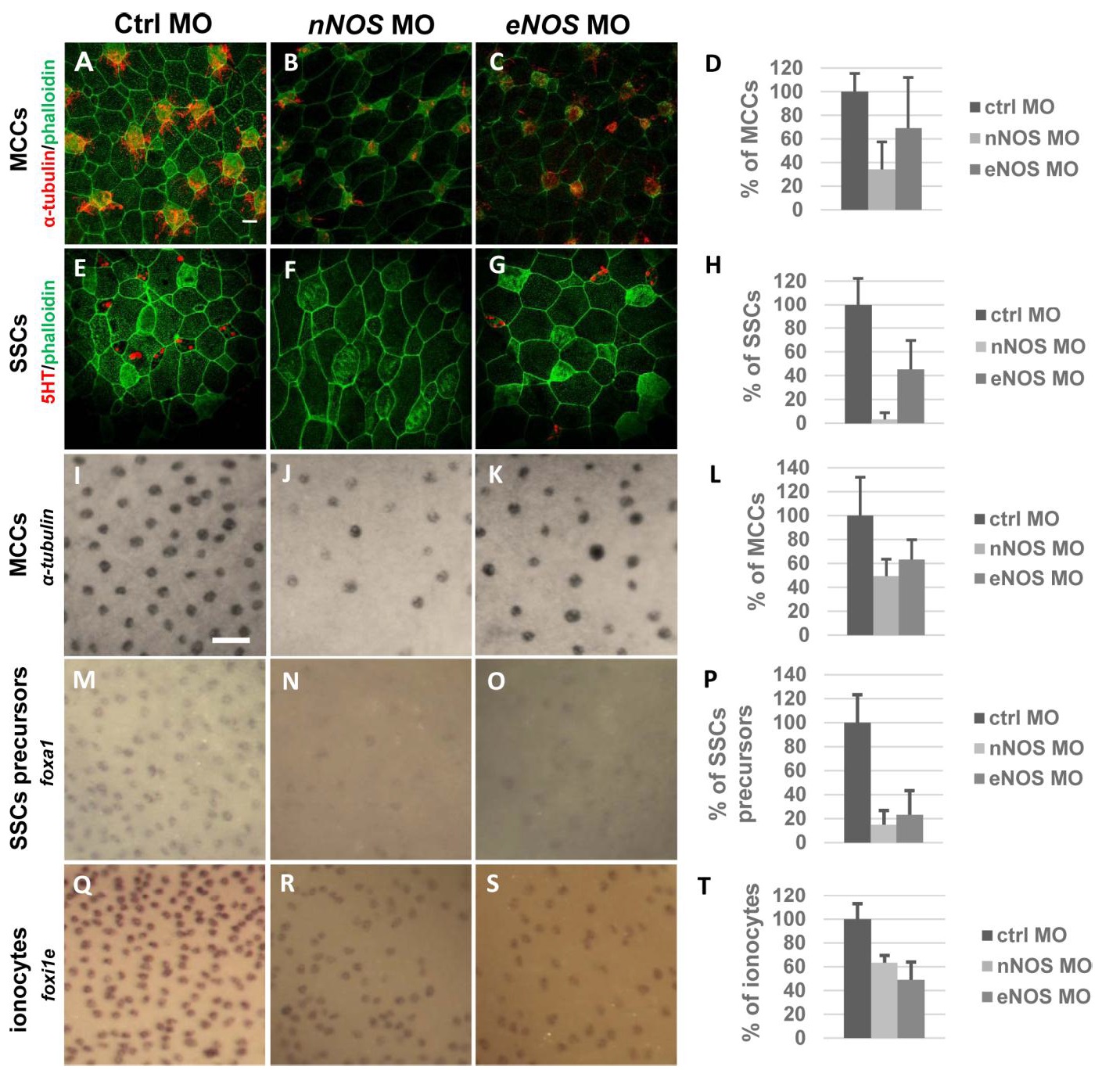 (C,G,K,O,S) MO. Injection of nNOS MOS (B,F,J,N,R) and eNOS MO (C,G,K,O,S) cause reduction in number of MCCs (D),