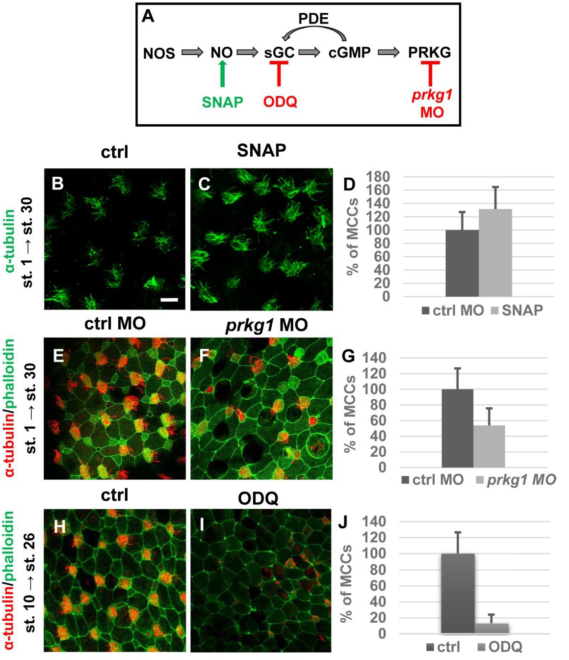 20 μm). Injection of SNAP increased number of MCCs and prkg1 MO reduced number of MCCs in embryonic epidermis.