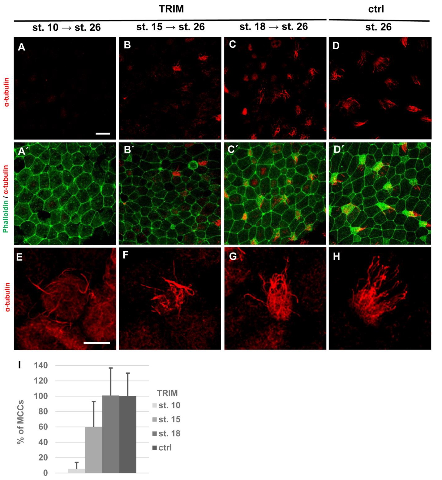 treated at stage 10 and 15 (A-B). Quantification of incidence of MCCs (I) error bars indicate + s.d., the P-value was < 0.03 (ctrl