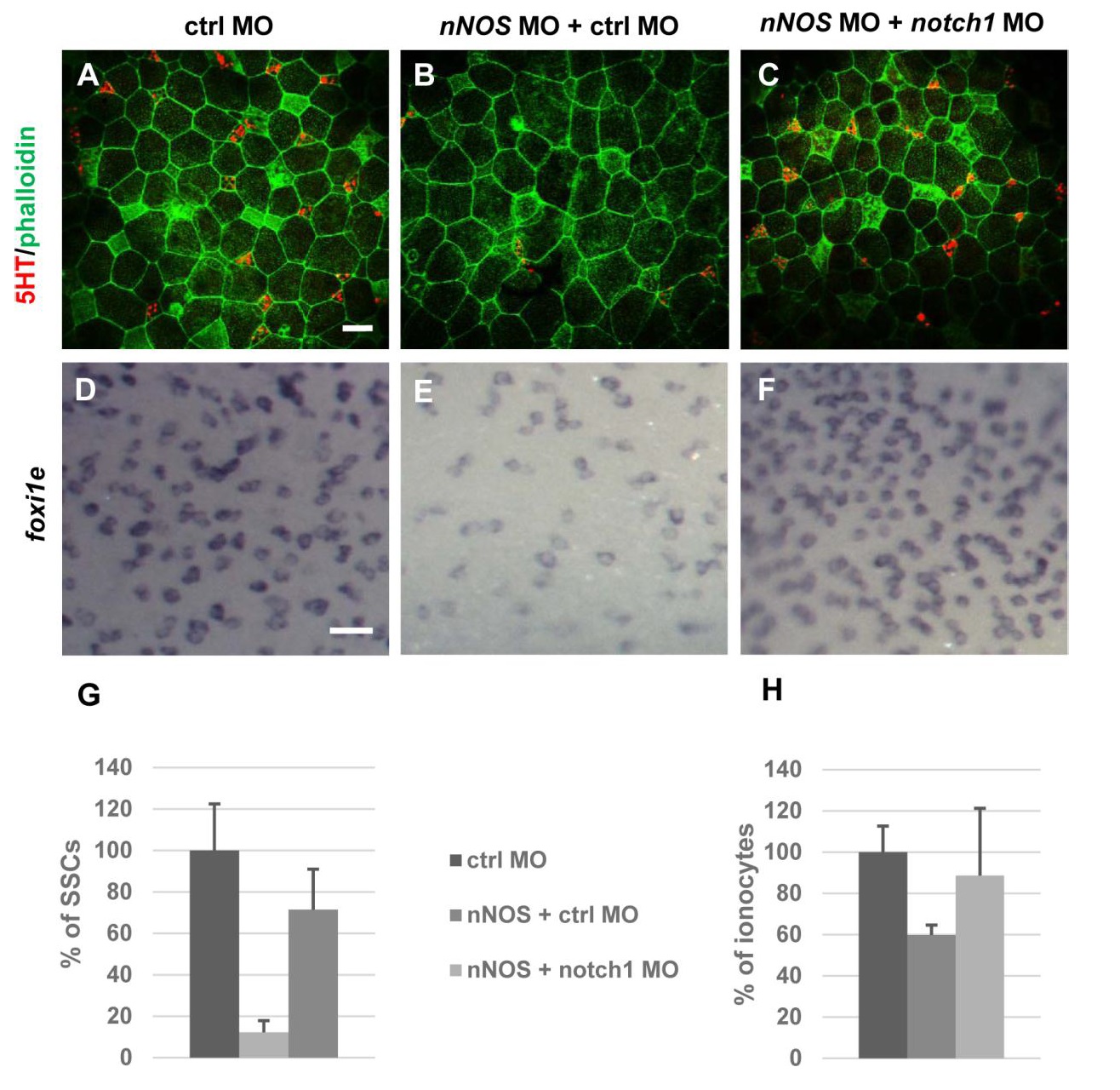 ionocytes (H), error bars indicate + s.d., the P-value was < 0,0002 (ctrl x nNOS + ctrl MO), < 0,13 (ctrl x nNOS + notch1 MO), <