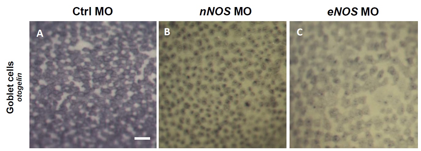 were decresed in embryos with inhibited NO production. Marker for goblet cells (itln2) was increased.