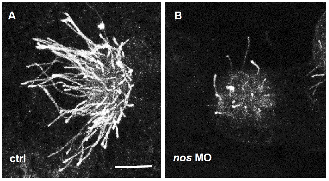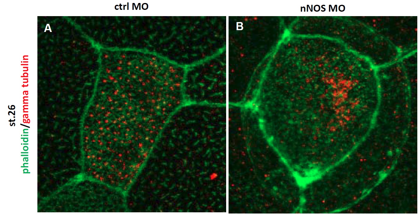 Ctrl MO (A) and nNOS MO (B) were injected into oocyte and fixed in 4% PFA at stage 26. Basal bodies were