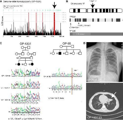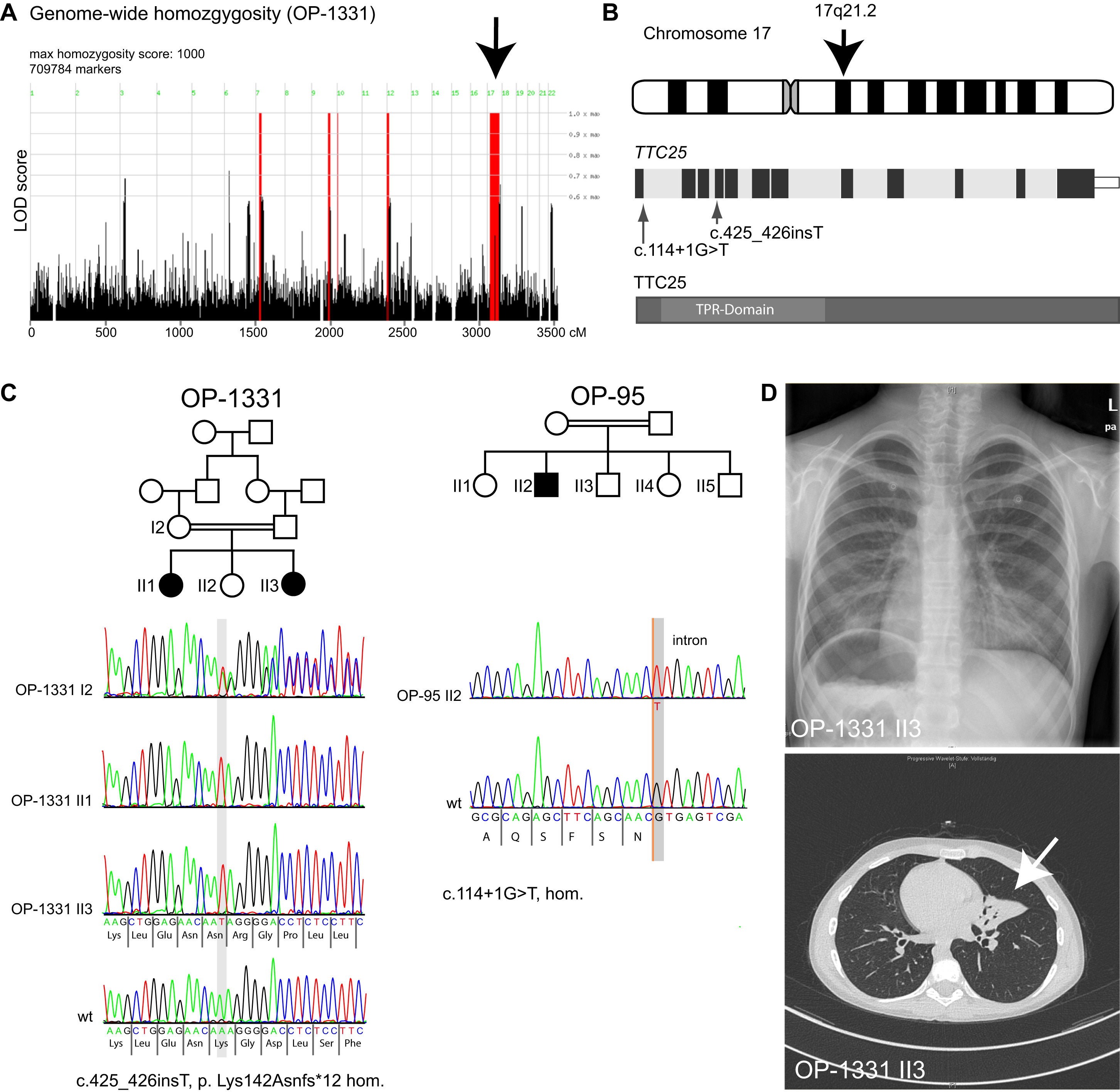 (A) Genome-wide homozygosity SNP studies in individuals OP-1331 II1 and OP-1331II3 revealed a large (50 Mb) homozygous region on chromosome 17, spanning the TTC25 locus (black arrow).