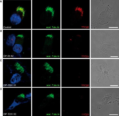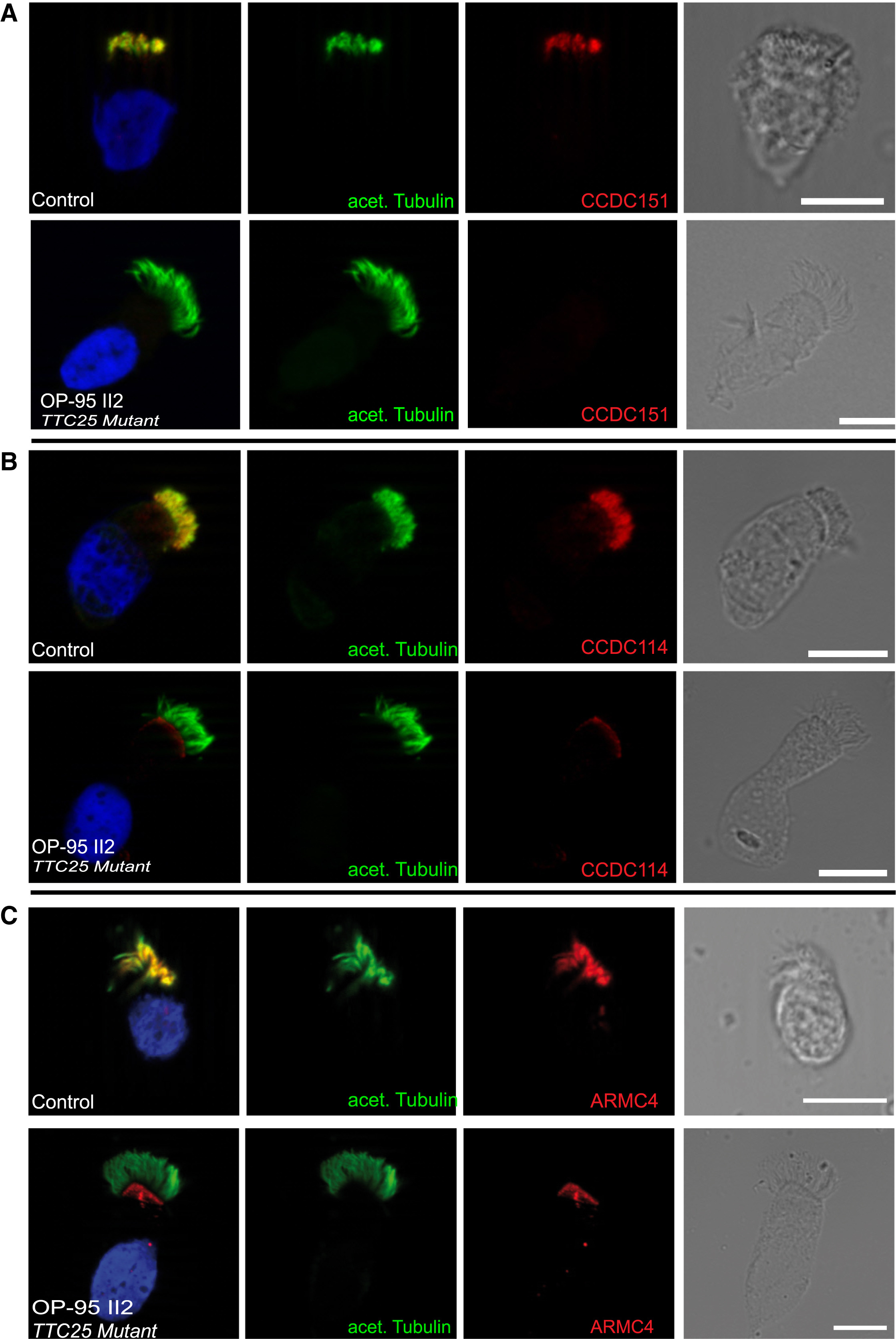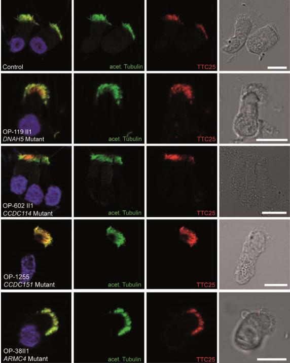 Respiratory epithelial cells from an unaffected control individual and from OP-95 II2, carrying TTC25 mutations, were double-labeled with antibodies directed against acetylated tubulin (green) and the ODA-DC components CCDC151 (Atlas Antibodies, HPA04418, 1:250) (red, A), CCDC114 (Atlas Antibodies, HPA042524, 1:500) (red, B), or ARMC4 (Atlas Antibodies, HPA037829, 1:500) (red, C). Yellow shows co-localization of CCDC151, CCDC114, or ARMC4 with acetylated tubulin in control axonemes (upper panels in A, B, and C). However CCDC151, CCDC114, and ARMC4 are absent from the ciliary axonemes of TTC25 mutant cells (lower panels in A, B, and C). The red signal, which is still visible in ARMC4- and CCDC114-deficient cells, is probably related to the unspecific binding of the polyclonal antibodies to the basal bodies and is probably not related to residual CCDC114 or ARMC4 within the cilia. The nuclei (blue) were stained with Hoechst33342 (Sigma, 14533-100MG, 1:1,000). Scale bars represent 10 μm.
