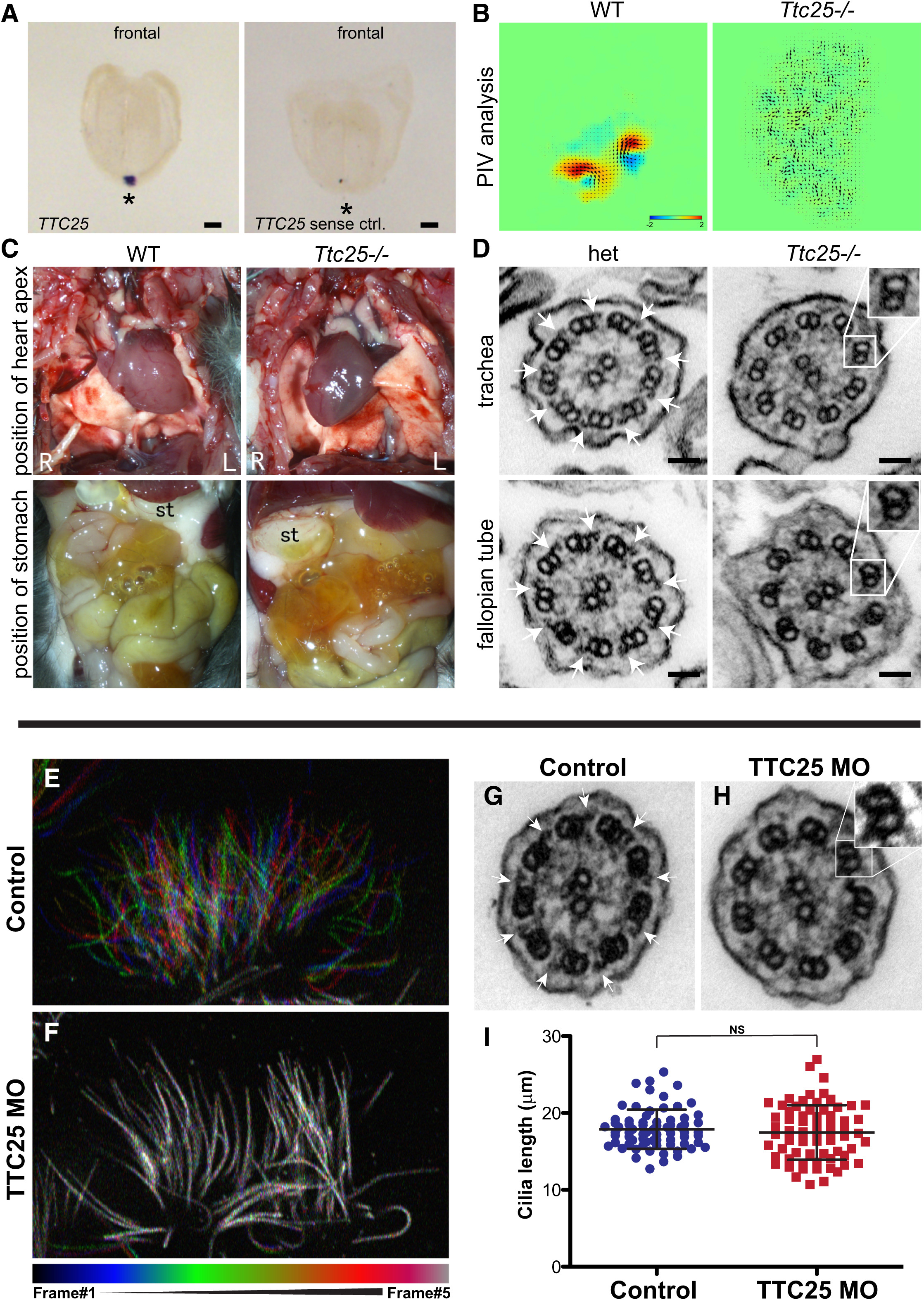 (C) Mice carrying the Ttc25 mutation show randomization of left-right body asymmetry. In wild-type mice, the heart apex points to the left side (top left). In mutant mice, shown here, it points to the right side (dextrocardia) (top right). The stomach (st) is localized on the left side in wild-type animals (bottom left), but was found on the right side in Ttc25 mutants (bottom right).