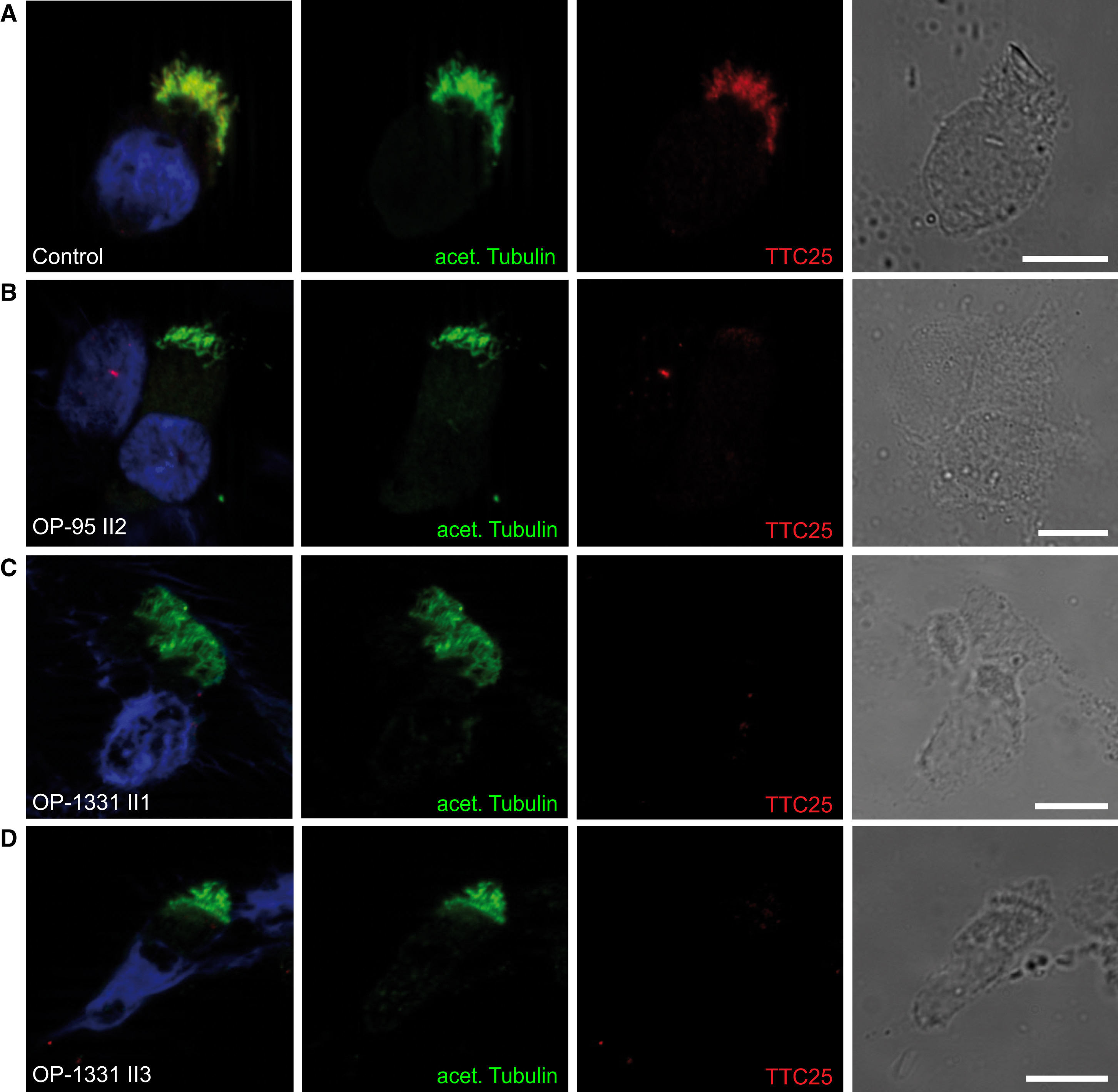 (B–D) TTC25 is absent in respiratory cells from individuals harboring recessive loss-of-function TTC25 mutations. Absence of TTC25 protein localization in the affected individuals OP-95 II2 (B), OP-1331 II1 (C), and OP-1331 II3 (D) is consistent with the detected loss-of-function mutations (c.114+1G>T and c.425_426insT) and confirms specificity of the polyclonal anti-TTC25 antibody (Abcam, ab157630, 1:500). The nucleus (blue) was stained with Hoechst33342 (Sigma, 14533-100MG, 1:1000).