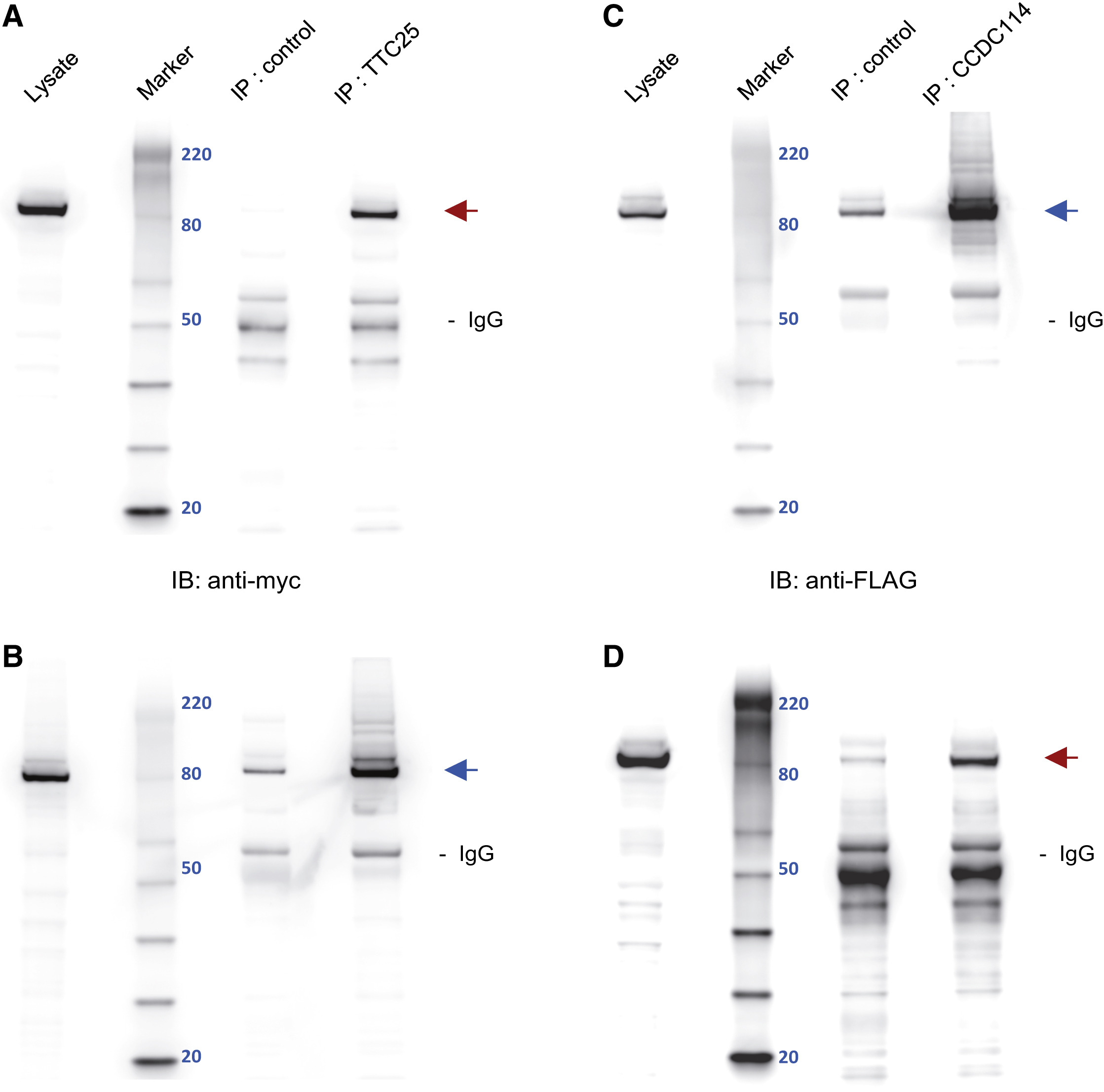 (A and B) Rabbit anti-TTC25 immunoprecipitates myc-tagged TTC25 (red arrow) and FLAG-tagged CCDC114 (blue arrow), as detected by immunoblotting (IB) with mouse anti-myc (Abcam, ab18185, 1:2000) and anti-FLAG (Sigma, F1804, 1:2000) antibodies.