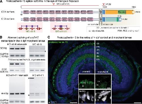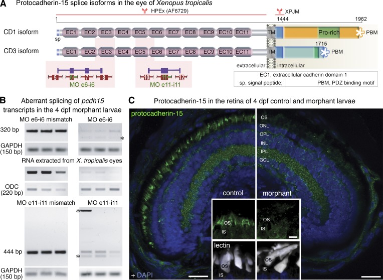 Figure 1. Antisense morpholino (MO) oligonucleotides block pcdh15 expression in the retina of X. tropicalis. (A) Predicted domain structure of the two splice isoforms of X. tropicalis protocadherin-15, positions of the antibodies used in the study, and pcdh15 MO e6-i6 and MO e11-i11. Aberrant splicing of pcdh15 transcripts is predicted to result in premature stop codons. (B) MO e6-i6 and MO e11-i11 affect pre-mRNA splicing and lead to several abnormal RT-PCR products (asterisks) because of intron retention, exon skipping, and the use of alternative splice sites. The overall reduction in the amount of the RT-PCR products is probably because of the nonsense-mediated decay of incorrectly spliced mRNAs. Abnormal transcripts and nonsense-mediated decay were not detected in control larvae microinjected with five-base mismatch control oligonucleotide. Ornithine decarboxylase (ODC) and glyceraldehyde 3-phosphate dehydrogenase (GAPDH) mRNAs were used as loading controls. (C) Lower levels of photoreceptor labeling for protocadherin-15 (green) in the 4 dpf larva microinjected with MO e6-i6 (right) than in the 4-dpf larva treated with the mismatch oligonucleotide control. Cell nuclei were stained with DAPI (blue). Insets: details of the inner segment (IS)âouter segment (OS) interface, with fluorescent lectins (white) and protocadherin-15 (green), staining is shown. ONL, outer nuclear layer; OPL, outer plexiform layer; INL, inner nuclear layer; IPL, inner plexiform layer; GCL, ganglion cell layer. Bars: (main) 20 µm; (insets) 5 µm. |