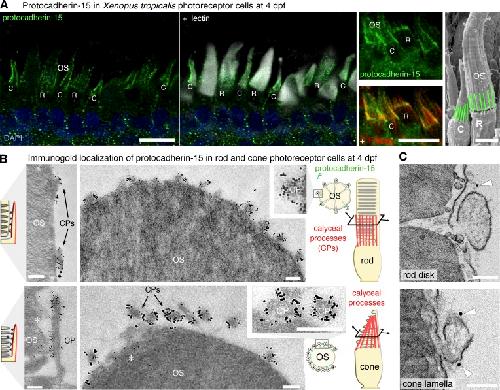 Figure 3. Protocadherin-15 is located at the calyceal processes of photoreceptor cells in X. tropicalis larvae. (A) In 4 dpf larvae, protocadherin-15 (green) is located around the base of the lectin-labeled (white) rod (R) and cone (C) outer segments (OS). Protocadherin-15 colocalizes with F-actin (red) that fill the calyceal processes (CPs). (B) In pre-embedding immunogold electron micrographs, silver-enhanced immunogold particles showed protocadherin-15 to be localized at the CPs surrounding the rod (top) and cone (bottom) OS. Sparse gold particles also decorate the lamellar membrane in cones (asterisks). (C) Protocadherin-15 immunolabeled gold particles (arrowheads) were localized with filaments connecting the CPs to the OS plasma membrane in rods (top) and cones (bottom). Bars: (A) 10 µm; (A, SEM image) 5 µm; (B) 200 nm; (C) 100 nm. |