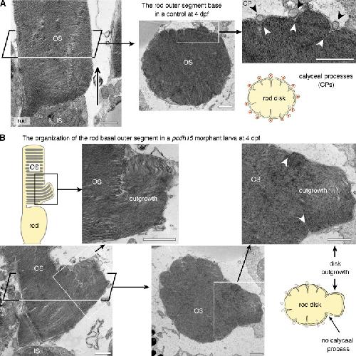 Figure 7. Pcdh15 knockdown in X. tropicalis causes distinct morphological alterations to the rod and cone outer segments and the associated calyceal processes (TEM analyses). (A) In longitudinal (left) and transverse (right) thin sections, control rod photoreceptors have the expected shape, with cylindrical, multilobed outer segments (OS). The calyceal processes (CPs) can be seen all around the OS, lying within (black arrowheads) and occasionally between incisures demarcating the lobes of the rod disks (see diagram). The base of the OS is congruent with the tip of the inner segment (IS; left, arrow). (B) In morphant larvae, several rods display an enlarged base (boxed areas), which TEM analysis revealed to consist of packets of outgrown disks extending well beyond the ISâOS interface and folding laterally. These outgrown disks are confined within the boundaries of the delimiting incisures (white arrowheads). The CPs are visible adjacent to the unaffected region but not adjacent to the basal enlargements of the OS (middle and right). Bars, 1 µm. |