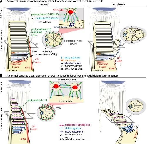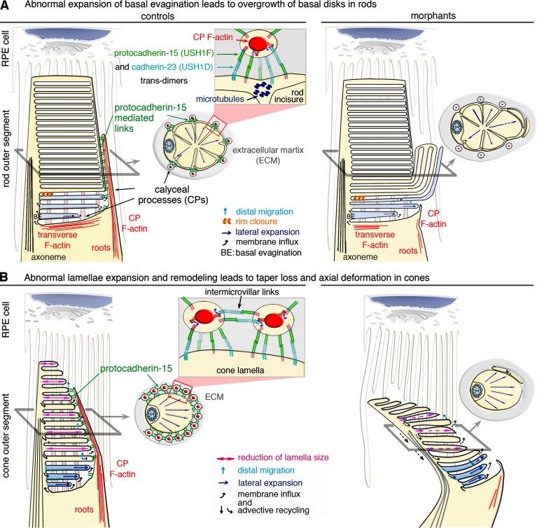 Figure 9. Model of the structural defects observed in the photoreceptors of morphant larvae. (A and B) In rod (A) and cone (B) photoreceptor cells, the basal evaginations (BEs) are formed with their leading edge exposed to the extracellular space. Calyceal processes (CPs) filled by F-actin (red) surround the base of the outer segment (OS) in control rods and cones (A and B, left). Links formed by trans-interactions between protocadherin-15 and cadherin-23 likely couple CPs to the OS membrane and to other CPs in the cones. The formation of trans-homotypic links, made up of either protocadherin-15 (Indzhykulian et al., 2013) or cadherin-23 cannot be excluded (A and B). (A, top left) Rod BEs form a continuous membrane system, topologically equivalent to cone lamellae. Lateral expansion of the BEs is tightly coupled to disk formation and distal displacement. Rim closure creates a discontinuity between the disk and the plasma membrane, precluding membrane redistribution in the plasmalemma. (top right) Uncontrolled lateral expansion of the nascent disks might lead to aberrant outgrowths, as shown in the pcdh15 morphant rods. In the morphant rods, the internal cytoskeleton of microtubules along the incisures may sustain the persisting CPs, although the F-actin cytoskeleton within the processes is markedly decreased. (B) Unlike rods, cones have no incisures, and the CPs do not anchor to microtubules. (bottom left) Preservation the cone OS shape requires a balanced distribution of forces and flows. Membrane input into the membrane folds of the cone lamellae at the OS base is equilibrated by advective recycling in the plasmalemma and apical shedding of older lamellae. This results in the lateral expansion, distal displacement, and progressive resizing of lamellae by retinal pigment epithelium (RPE) cells. (bottom right) In pcdh15 morphant cones lack CPs; disturbance of the balance between these antagonistic forces causes taper loss and an abnormal axial curvature of the OS. |