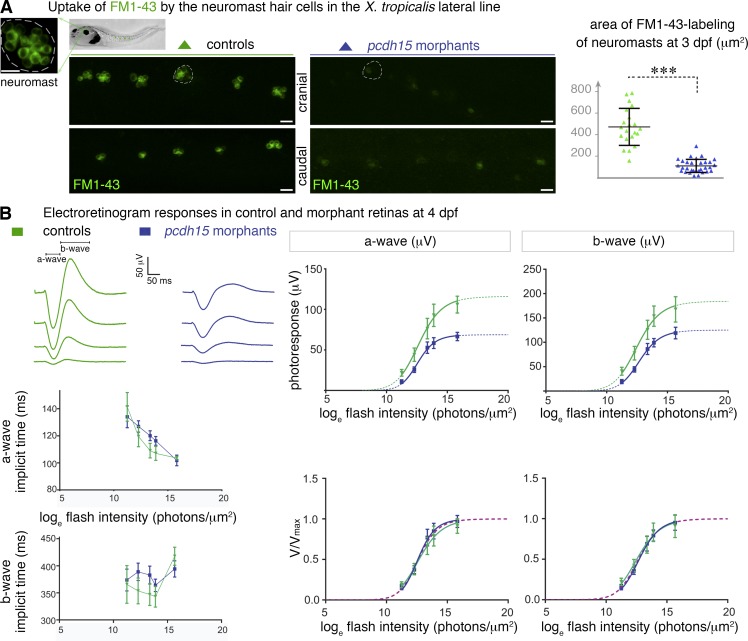 Figure 2. Pcdh15 morphant larvae have altered mechanoelectrical transduction channels and photosensory deficits. (A) Uptake of FM1â43 dye by the hair cells of cranial and caudal neuromasts (high magnification of a neuromast, with 6â12 sensory hair cells shown). Dye uptake in neuromasts (some are outlined) is much weaker in 3-dpf pcdh15 morphants than it is in controls: 120.6 ± 15.5 µm2 in morphants (mean ± SEM; n = 33), versus 471.2 ± 37.5 µm2 in controls (n = 21; unpaired t test, ***, P < 0.0001). (B, top left) Representative electroretinogram traces (flash intensity increasing from bottom to top). (bottom left) The time-to-peak values obtained for the a- and b-waves (implicit times) did not differ significantly between controls and morphants. (right) Photoresponse curves (V, μV), plotted as a function of flash intensity and fitted with the NakaâRushton function, in morphants and controls. The responses show a significant attenuation in morphants (comparison of fits by the least-squares method: P < 0.0001 for both waves), whereas after normalization by the maximum value Vmax, they do not differ significantly, giving similar values of I0.5 (P > 0.5 for both waves; bottom right panel; n = 7 controls, 13 morphants). Bars, 20 µm. |