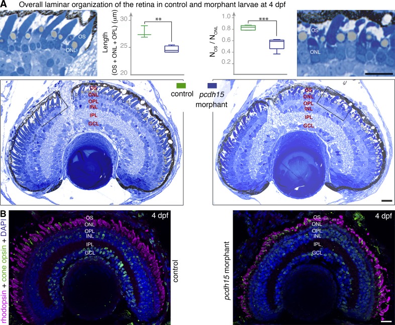 Figure 4. Pcdh15 knockdown in X. tropicalis does not affect retinal morphogenesis. (A) Semithin sections of control and morphant retinas at 4 dpf. The retinal layer shows similar organization in morphant and control retina. However, a loss of alignment and shape alterations of the photoreceptor outer segments (OS) are seen in the morphants (see high magnification of the boxed areas). The outer retina is significantly thinner in the morphants: thickness of the OS, outer nuclear layer (ONL), and outer plexiform layer (OPL) (L(OS + ONL + OPL) = 24.6 ± 0.3 µm, mean ± SEM, in morphants versus 27.7 ± 0.6 µm in controls, n = 3â4; unpaired t test, **, P = 0.005. The ratio of the number of OS profiles (NOS) to that of nuclei (NONL) is also significantly lower in morphants (0.55 ± 0.05, mean ± SEM, in morphants versus 0.83 ± 0.02 in controls, n = 5; unpaired t test, ****, P = 0.0005). (B) Cryosections of 4 dpf retinas stained with antibodies against rhodopsin (magenta) and cone opsin (green) show no evidence of opsin mislocalization in the morphant retina, but the shape and organization of both cones and rods are altered. INL, inner nuclear layer; IPL, inner plexiform layer; GCL, ganglion cell layer. Bars, 20 µm. |
