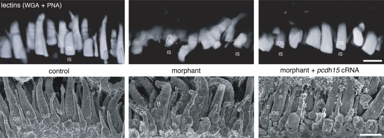 Figure 5. The photoreceptor outer segments are misaligned in pcdh15 morphant larvae. 3D rendering of the confocal stacks obtained from acrylamide-embedded vibratome sections (150 µm thick) stained with fluorescent lectin (top) and from SEM micrographs (bottom), highlighting the orderly arrangement of the subretinal space in 4 dpf control retinas (left). In contrast, age-matched morphant retinas contain photoreceptors with misshapen, curved, and misaligned outer segments (OS; middle). The coinjection into the embryo of cRNAs encoding the protocadherin-15 CD1 and CD3 isoforms with the splice-blocking morpholinos essentially preserved the well-ordered organization and parallel alignment of the OS in the larva (right). IS, inner segment, C, cone, R, rod. Bars, 10 µm. |