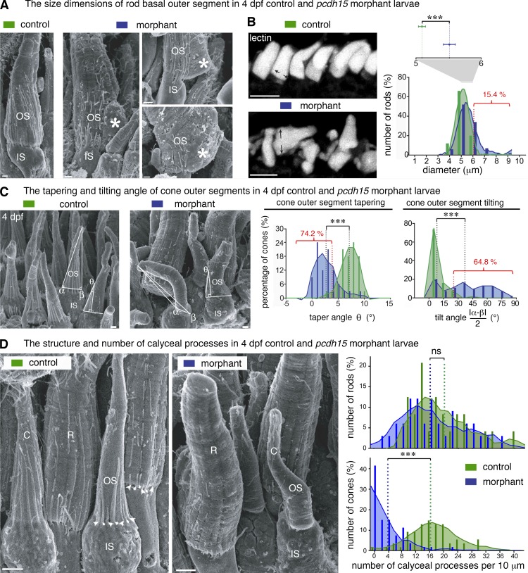 Figure 6. Pcdh15 knockdown in X. tropicalis causes distinct morphological alterations to the rod and cone outer segments and the associated calyceal processes (scanning electron microscopy analyses). (A) In scanning electron micrographs, rod outer segments (OS) of 4-dpf morphants often display basal swelling and bulges, observed in 24 of 126 (19%) of morphant rods (n = 3 retinas, 95% CI, 17.3â19.3%). Occasionally, the base of the OS (asterisks) extended well beyond the edge of the inner segment (IS). Calyceal processes (CPs) are not detected adjacent to the basal outgrowths (asterisks). (B) In control retinas (top left), the basal diameters of the rod OS stained with WGA lectin (white) have a distribution close to normal (green bar graph and curve), centered on 5.1 ± 0.05 µm (mean ± SEM, n = 99; DâAgostinoâPearson test, P = 0.8; skewness: 0.15). In morphant retinas, the diameters have a non-normal distribution (blue bar graph and curve), centered on 5.5 ± 0.1 µm with a large positive skew (n = 104; DâAgostinoâPearson test, P < 0.0001; skewness: 1.16). In morphant retinas, the basal diameter of rods was significantly larger than in controls (unpaired t test, ***, P < 0.001), greater than two SDs from the control mean in 16 of 104 (15.4%) morphant rods. (C) At 4 dpf, control cone photoreceptors possess a slender OS coaxial with the IS and are characterized by a pronounced conical taper; both features are altered in the morphant cones. The OS tilt and taper were estimated on scanning electron micrographs by measuring the basal angles α and β and the taper angle θ at 5 µm from the ISâOS interface. The frequency histograms for tilt and taper angles show a narrow distribution of tilt angles centered on 5.8° (median value, n = 68) in control larvae, whereas in the morphants, the distribution is wider and flatter (median value, 36.5°; n = 54), reflecting considerable variability in tilt (K-S test, ***, P < 0.0001; bin width, 10°); 35 of 54 (64.8%) of the morphant cone OS had a tilt more than 2 SD greater than the control mean. The taper angle of the morphant cone OS was significantly smaller than that of the controls (2.7 ± 0.4°, n = 31; and 7.1 ± 0.3°, n = 32, respectively [mean ± SEM]; bin, 3°; K-S test, ***, P < 0.0001); 23 of 31 (74.2%) of morphant cone OS had a taper more than 2 SD less than the control mean. (D) We determined the number of calyceal processes (CPs) by counting them at their point of emergence (arrowheads) and plotted that number as linear density (number of CPs per 10 µm of ISâOS interface) for both rod (R) and cone (C) photoreceptors. Frequency distributions (bin width, 2 CPs per 10 µm) are significantly lower in morphant cones, but not in the rods. Mean densities in rods (in CPs per 10 µm): controls, 19.4 ± 1.6 (mean ± SEM, n = 24); morphants, 16.5 ± 1.5 (n = 33); K-S test, P = 0.27. Mean densities in cones: controls, 16.7 ± 0.8 (n = 53); morphants 3.7 ± 0.6 (n = 53); P < 0.0001. Bars: (A and C) 1 µm; (B) 10 µm; (D) 5 µm. |