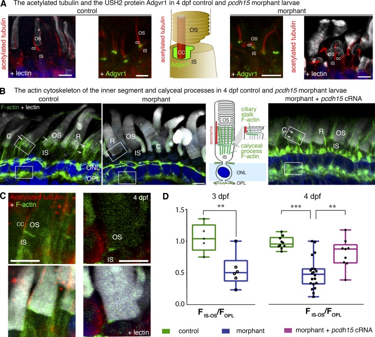 Figure 8. The actin cytoskeleton of the calyceal processes and their roots is disrupted in pcdh15 morphant larvae. (A) The axoneme, stained with antibodies against acetylated tubulin (red), is present in the morphant cone photoreceptors, but it is often curved and bent. The typical distribution of the USH2 protein Adgrv1 (green) at the base of the axoneme, in the periciliary ridge complex, is preserved in morphant photoreceptors. (B) At the inner segment (IS)âouter segment (OS) interface, there are two F-actin networks: the transverse F-actin network at the apical surface of the IS, and the longitudinal F-actin bundles of the calyceal processes and their roots (arrows). In 4-dpf morphant retinas, morphants display less phalloidin staining at the ISâOS interface (middle) than do the age-matched controls (left). F-actin staining in morphant photoreceptors is restored by the coinjection into the embryo of pcdh15 cRNAs with the pcdh15 MO e6-i6 (see arrows in the right panel). (C) The transverse F-actin network (green) can still be observed in a morphant photoreceptor. (D) Measurements of F-actin fluorescence intensity in the ISâOS interface (FISâOS) compared with the subjacent region of the outer plexiform layer (OPL) (FOPL, taken as a reference) showed an FISâOS/FOPL ratio that is 50% lower in the morphants than in the controls. The F-actin cytoskeleton was partially preserved in the retinas of 4-dpf morphants after the coinjection into the embryo of pcdh15 cRNAs and pcdh15 MO e6-i6 (FISâOS/FOPL ratio 20% smaller than in controls). The FISâOS/FOPL ratio at 3 dpf: controls, 1.05 ± 0.10 (n = 5); morphants, 0.54 ± 0.1 (n = 6), mean ± SEM; unpaired t test, **, P = 0.007. At 4 dpf: controls, 0.97 ± 0.03 (n = 10); morphants, 0.48 ± 0.06 (n = 20); morphants + cRNAs, 0.81 ± 0.08 (n = 9); unpaired t tests: controls versus morphants, ***, P < 0.0001; morphants versus morphants + cRNAs, **, P = 0.002; controls versus morphants + cRNAs, P = 0.05. Bars, 5 µm. |
