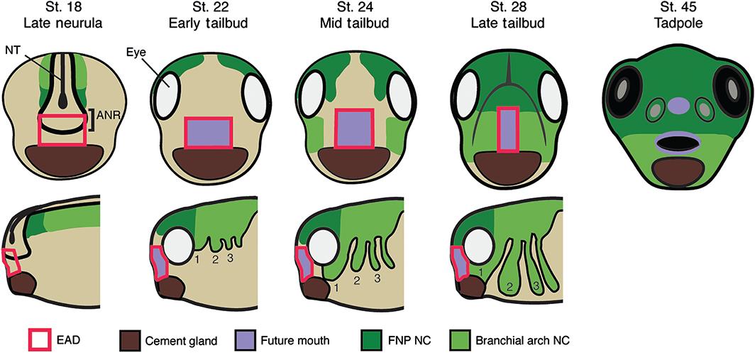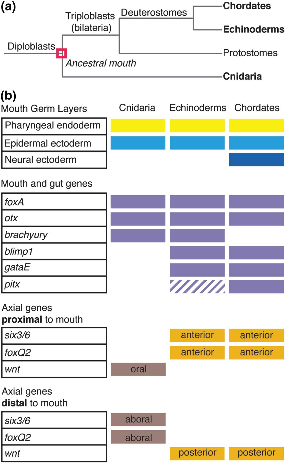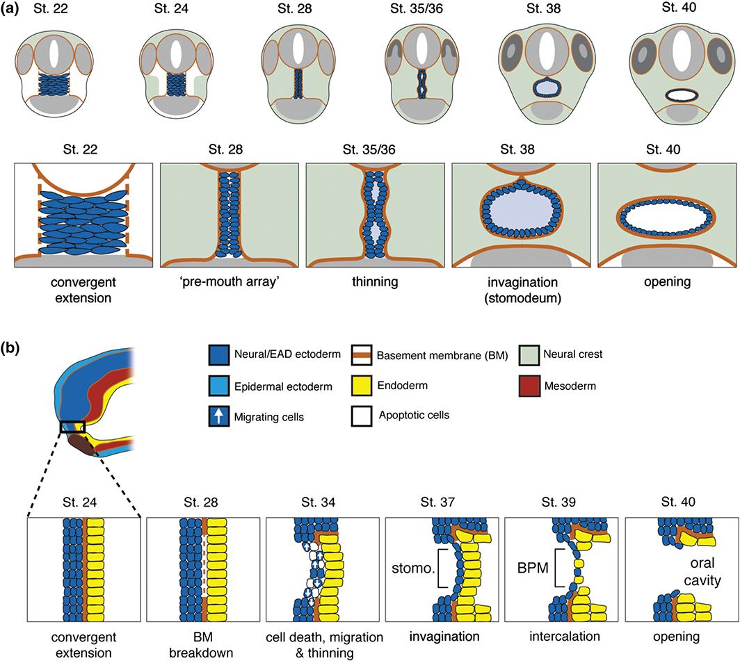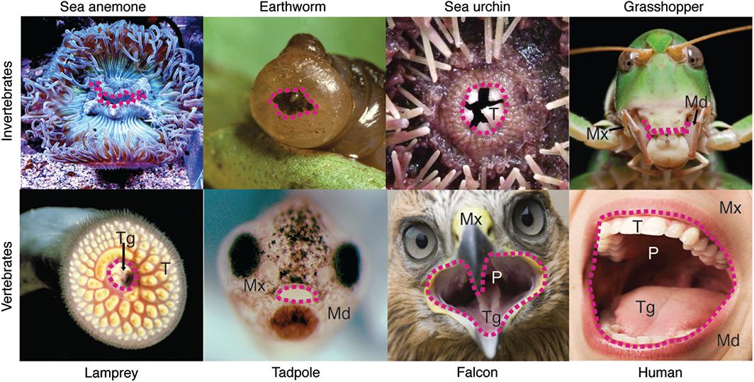A mouth is present in all animals, and comprises an opening from the outside into the oral cavity and the beginnings of the digestive tract to allow eating. This review focuses on the earliest steps in mouth formation. In the first half, we conclude that the mouth arose once during evolution. In all animals, the mouth forms from ectoderm and endoderm. A direct association of oral ectoderm and digestive endoderm is present even in triploblastic animals, and in chordates, this region is known as the extreme anterior domain (EAD). Further support for a single origin of the mouth is a conserved set of genes that form a 'mouth gene program' including foxA and otx2. In the second half of this review, we discuss steps involved in vertebrate mouth formation, using the frog Xenopus as a model. The vertebrate mouth derives from oral ectoderm from the anterior neural ridge, pharyngeal endoderm and cranial neural crest (NC). Vertebrates form a mouth by breaking through the body covering in a precise sequence including specification of EAD ectoderm and endoderm as well as NC, formation of a 'pre-mouth array,' basement membrane dissolution, stomodeum formation, and buccopharyngeal membrane perforation. In Xenopus, the EAD is also a craniofacial organizer that guides NC, while reciprocally, the NC signals to the EAD to elicit its morphogenesis into a pre-mouth array. Human mouth anomalies are prevalent and are affected by genetic and environmental factors, with understanding guided in part by use of animal models. WIREs Dev Biol 2017, 6:e275. doi: 10.1002/wdev.275 For further resources related to this article, please visit the WIREs website.
