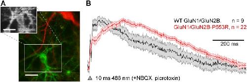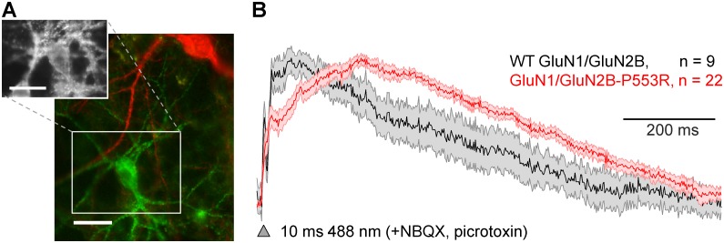 Fig 7. Effect of GluN2B-P553R on the NMDAR component of the EPSP.A, Red shows the presynaptic neuron expressing a channelrhodopsin variant (CheRiff) and green shows postsynaptic neuron transfected with GFP-GluN2B or GFP-GluN2B-P553R and a QuasAr voltage indicator (inset). Scale bars, 30 μm. B, Optically-evoked and optically-monitored EPSPs. The mean postsynaptic EPSP is given for neurons expressing GFP-GluN2B-P553R (red) or GFP-GluN2B (black). Shading represents s.e.m; n = number of neurons. EPSPs are shown normalized to peak (see Methods).