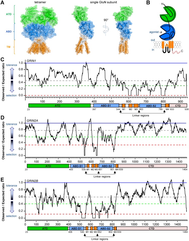 Fig 1. Intolerance analysis of genetic variation across functional domains of GluN1, GluN2A and GluN2B.A, Ribbon structure of homology model of a tetrameric NMDAR and a single GluN subunit [10,12]. B, A cartoon illustrating the domain arrangement of an individual GluN subunit. ATD—amino terminal domain (in GREEN), S1 and S2 –first and second polypeptide sequences comprising the agonist binding domain (ABD, in BLUE), linker regions (S1-M1 linker, M3-S2 linker, and S2-M4 linker; in GRAY), M1, M3, and M4 –transmembrane domains (TM, in ORANGE), M2 –re-entrant pore loop (in ORANGE), and CTD—carboxy-terminal domain (in PINK). C, GRIN1; D, GRIN2A; E, GRIN2B: Sliding window OE-ratio estimates (black full line), Neutrality expected OE-ratio estimate (blue full line), Median OE-ratio for the gene (dark grey dashed line), 25th percentile of OE-ratio (green dashed line), 5th percentile of OE-ratio (red dashed line).