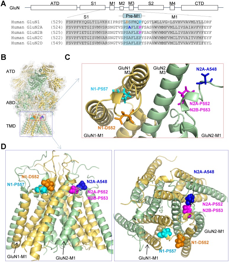 Fig 2. Locations of pre-M1 mutations.A, Domain architecture of NMDARs and protein sequence alignment showing pre-M1 helix across NMDAR subunits. B-D, Ribbon structure of homology model of GluN1/GluN2A built from GluN1/GluN2B [10,12]. Five residues harboring mutations in human patients are highlighted: GluN1-D552E (in GOLD), GluN1-P557R (in LIGHT BLUE), GluN2A-A548T (in BLUE), GluN2A-P552R (in MAGENTA), and GluN2B-P553L (in MAGENTA). The mutation labels refer to GluN1 as N1 and GluN2 as N2. ATD—amino terminal domain, S1 and S2 –first and second polypeptide sequences comprising the agonist binding domain (ABD), M1, M3, and M4 –transmembrane helices, and M2 –re-entrant pore loop. The mutation information is given in Table 2.