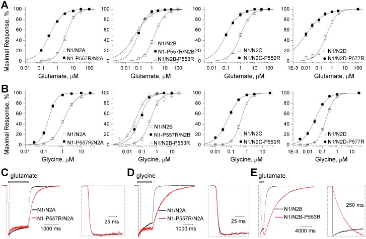 Fig 5. Conserved effects of the Pro552Arg mutation across GluN2 subunits.A,B, Composite concentration-response curves of glutamate in the presence of 100 μM glycine (A) and glycine in the presence of 100 μM glutamate (B) for human GluN1-P557R/GluN2A, GluN1-P557R/GluN2B, GluN1/GluN2B-P553R, and rat GluN1/GluN2C-P550R, and GluN1/GluN2D-P577R. The graph legends refer to GluN1 as N1 and GluN2 as N2. Fitted EC50 values are summarized in Tables 3 and 5. C,D, human GluN1-P557R/GluN2A significantly prolongs deactivation time course after removal of glutamate (C) or removal of glycine (D) on transfected HEK293 cells, but does not slow the rise time when the receptors were activated by the agonists. E, GluN1/GluN2B-P553R significantly slows rise time and prolongs deactivation time course. Fitted parameters describing the response time course are given in Table 6.
