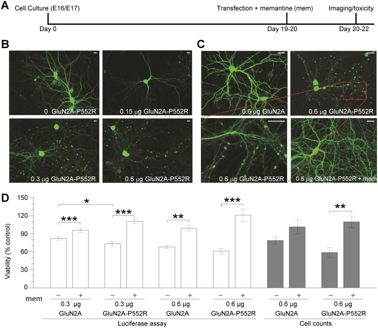 Fig 8. Neurotoxic consequences of GluN2A-P552R expression and rescue pharmacology.A, Schematic of experimental timeline indicates the relative dates of neuronal cell culture from embryonic day 16/17 (E16/17), transfection along with memantine/vehicle treatment, and toxicity studies (luciferase assays, cell counts, and confocal imaging). B, Confocal images of cortical neurons transfected with a GFP-expressing construct, with various concentrations of the human GluN2A-P552R-expressing plasmid illustrate the cell morphology. Images were acquired 24 h post-transfection at 20× magnification (scale bars 10 μm). C, Confocal images of cortical neurons transfected with GFP-expressing construct with either 0.6 μg cDNA per well (40% of total transfection cDNA) of WT GluN2A or GluN2A-P552R, the latter in the absence or presence of memantine (50 μM). Images were acquired 24 h post-transfection at 20× magnification, with the exception of the bottom left panel (40×), which highlights GluN2A-P552R-induced dendritic swelling and blebs (scale bar 10 μm). D, The mean cell viability values are shown as a percent of control. Luciferase assays: neuronal cultures were transfected with GFP-N1 plasmid (0.525 μg or 0.825 μg per well) luciferase cDNA (0.375 μg/well) for cell viability assaying, with varied concentrations (0.3 μg or 0.6 μg per well) of pCIneo-vector, WT GluN2A, or GluN2A-P552R cDNA (1.5 μg total DNA per well). Each transfection condition was performed in pairs, either supplemented with vehicle (–) or memantine (20 μM for 0.3 μg; 50 μM for 0.6 μg) treatment (+). Luciferase assays were performed 48 h following transfection and treatment. Experiments were performed in quadruplicate, and independent experiments were repeated (0.3 μg cDNA, n = 7; 0.6 μg cDNA, n = 8). Each condition was normalized to its relevant vector-transfected group to obtain relative viability values, expressed as % control. Data are mean ± SEM of viability (% control) for each condition (ANOVA/Bonferroni; *p <0.05, **p < 0.01, ***p < 0.001). Cell counts: Neuronal cultures were transfected with GFP-N1 plasmid for cell visualization, with either 0.6 μg pCIneo including vector, WT GluN2A, or GluN2A-P552R cDNA (40% of total transfection cDNA). Each transfection condition was performed in duplicate. Cell counts were performed 48 h post-transfection (Methods). Data are mean ± SEM of viability (% control) for each condition in 6 independent experiments. ANOVA/Bonferroni (**p < 0.01). See S9 Table for statistics.