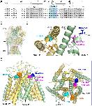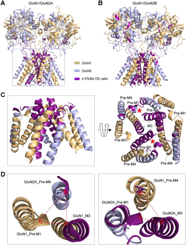 Fig 9. Potential interaction between the pre-M1 and M3 helices.A,B, Ribbon structures of the GluN1/GluN2A (A) and GluN1/GluN2B (B) receptors without the amino terminal domain is shown. GluN1 is tan and GluN2 is light blue; regions with an OE-ratio below the 5th percentile are colored purple, and indicate the regions under the strongest purifying selection. C, Side and top down view of the pore forming elements M1, M3, M4 in GluN1/GluN2A receptors colored as in (A), with regions of purifying selection shown in purple. D, Expanded view of the pre-M1 helix for GluN1 (left panel) and for GluN2A (right panel).