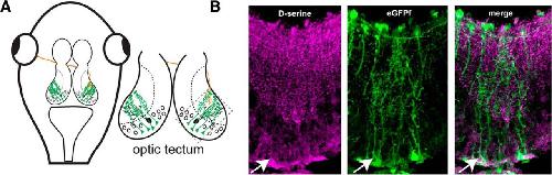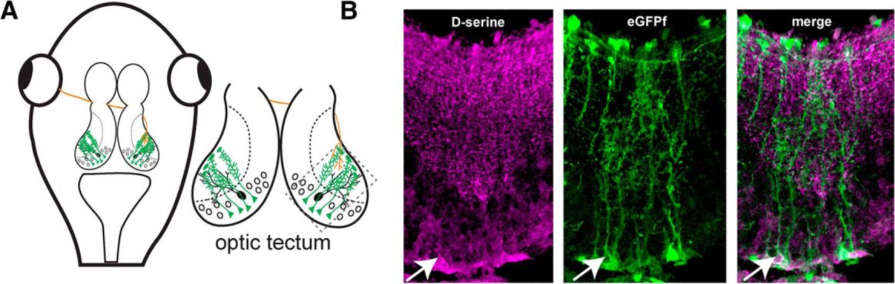 D-Serine is present in radial glial cells in the optic tectum. A, Schematic of the Xenopus tadpole optic tectum showing radial glia cells (green), RGC axons (red), and tectal neurons (black). B, Confocal image of immunohistochemical staining showing that the gliotransmitter d-serine (magenta) colocalizes with farnesylated EGFP (green) expressed in radial glial cell bodies (arrowhead), in their endfeet and in varicosities on glial fine processes throughout the tectal neuropil. Lateral is up.
