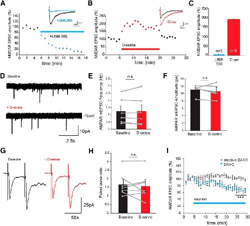 D-Serine is an endogenous coagonist of NMDARs at retinotectal synapses in the optic tectum. A, B, Example NMDAR-mediated retinotectal ESPCs recorded following optic chiasm stimulation in 0 mm Mg2+, in the presence of NBQX (20 μm) and PTX (100 μm), from Stage 47 tadpoles (A) before (black trace) and after (blue trace) wash-on of the NMDAR coagonist site antagonist L-689,560 (20 μm) and (B) agonist d-serine (500 μm, red). Insets, Averages of three trials during baseline and after 3 min of drug application. C, Mean relative changes in NMDAR-mediated EPSC amplitude measured during the last 3 min of drug application. D, Example AMPAR-mediated mEPSC traces recorded from tectal neurons at â70 mV before (top) and after d-serine (bottom) application. Average mEPSC (E) frequency and (F) amplitude across the population of cells before and after d-serine application are unchanged (n = 6, frequency: p = 0.95, amplitude: p = 0.35, paired t test). G, Examples of evoked AMPAR-mediated EPSCs recorded during a 50 ms ISI paired pulse protocol before (black) and after d-serine (red) application. H, Average PPR before and after d-serine application across the population of cells is unaltered (p = 0.60, n = 7, paired t test). I, Average NMDAR-mediated EPSC response decrement with RgDAAO (0.2 U/ml, blue, n = 5; ***p = 0.00037) wash-on and NMDAR-mediated EPSCs showing lack of effect of heat-inactivated RgDAAO (gray, n = 3, p = 0.70, t test).
