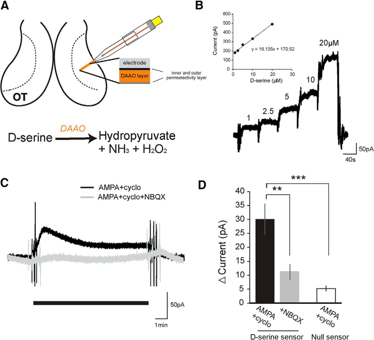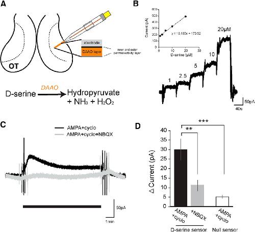 In situ detection of d-serine release in the optic tectum. A, Schematic of the placement of the d-serine biosensor into the neuropil of the optic tectum adjacent to the tectal cell body layer. d-Serine reacts with immobilized DAAO on the probe, degrading into hydroxypyruvate, ammonia, and hydrogen peroxide, which is oxidized at the biased platinum surface. B, Example calibration of biosensor with standard d-serine solutions (1, 2.5, 5 10, 20 μm) perfused into the recording chamber. Slope of the calibration curve for each experiment was used to calculate released d-serine concentrations. C, d-Serine release was stimulated by perfusing external solution containing AMPA (100 μm) with cyclothiazide (50 μm) to activate AMPARs and to block receptor desensitization, respectively. D, Average change in current detected by the d-serine or control null sensor during the last 2 min after wash-on of AMPA and cyclothiazide (black, d-serine sensor: n = 11; null sensor: n = 7) or AMPA, cyclothiazide, and NBQX (gray, d-serine sensor: n = 7). **p = 0.01, AMPA versus AMPA + NBQX (t test). ***p = 0.0015, AMPA versus null + AMPA (t test).