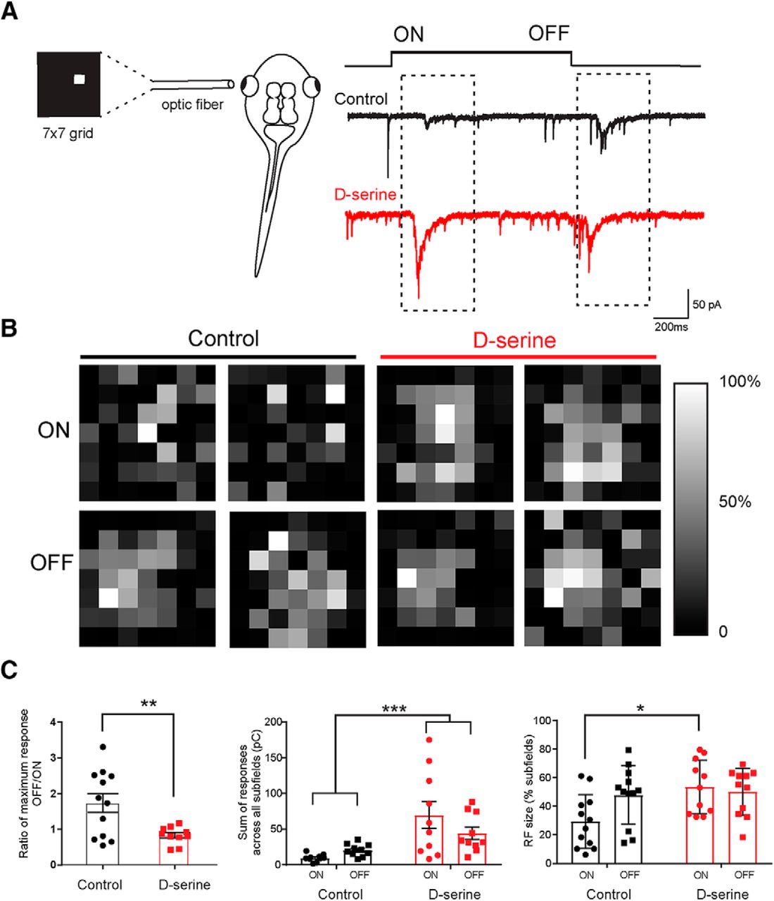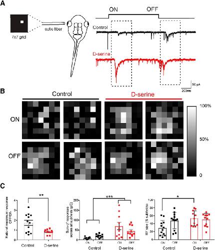 D-Serine increases receptive field size for ON responses. A, Schematic representation of the receptive field mapping setup. An optic fiber displaying a 7 Ã 7 grid of 49 individual subfields was aligned with the eye. Representative traces of whole-cell EPCSs recorded in the contralateral optic tectum in response to stimulus onset (ON) and stimulus offset (OFF) (control, black trace) (d-serine raised, red trace). B, Receptive field maps for tectal neurons in two example control cells and in two cells from animals raised in d-serine. Receptive fields were generated based on synaptic responses to bright ON stimulation in each subfield (top) and to the stimuli turning OFF (bottom) 1 s later. Receptive fields are plotted in grayscale. White represents the strongest subfield response. C, Left, Ratios of maximum CSC generated for an OFF response to the maximum CSC for an ON response show that the relatively stronger OFF response compared with the ON response consistently seen in control cells is equalized in d-serine cells (control, n = 12; d-serine, n = 10). **p < 0.001 (t test with one outlier removed by the ROUT outlier test). Middle, Sum of the CSCs evoked at all subfields is larger in animals raised in d-serine compared with control cells. ***p < 0.001 (two-way ANOVA, with Bonferroni post test; 3 cells removed by ROUT outlier test). Right, ON receptive fields are larger in animals raised in d-serine than in control animals. *p < 0.05 (two-way ANOVA with Bonferroni post test).