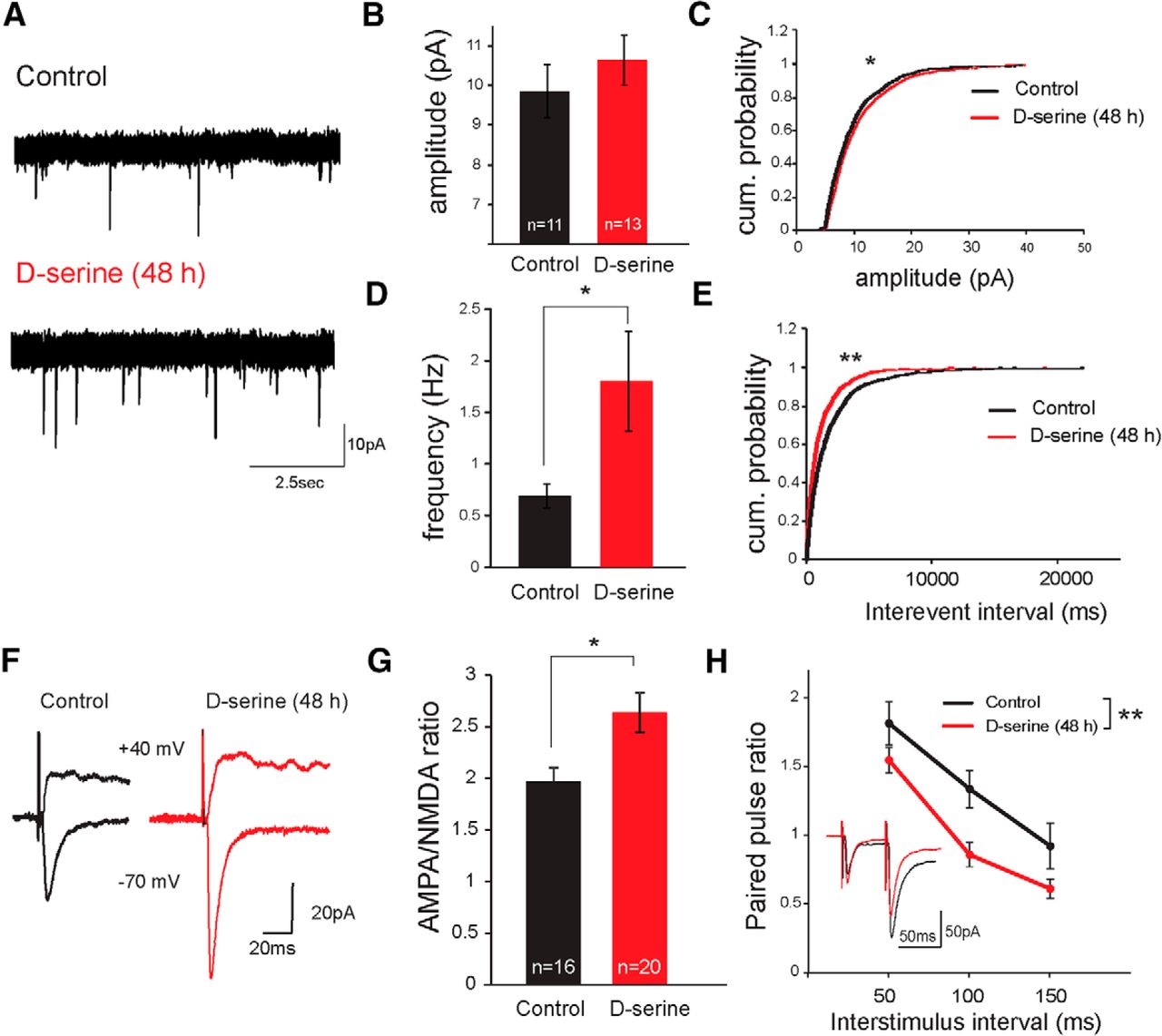 D-Serine promotes synaptic maturation at retinotectal synapses. A, Example AMPAR-mediated mEPSC traces recorded from tectal neurons in a control animal (top) and an animal exposed to d-serine for 48 h (bottom). B, AMPAR-mEPSCs from neurons in control animals (black) and in animals exposed to d-serine (100 μm) for 48 h (red) did not reveal a significant shift in mean amplitude (p = 0.21, Student's t test). C, The distribution of mEPSC amplitudes (100 randomly selected events per cell) shows a modest rightward shift in the cumulative probability plot. *p < 0.05 (Kolmogorov–Smirnoff test). D, AMPAR-mEPSC frequency increased dramatically in d-serine-exposed cells. *p < 0.05 (Mann–Whitney test). This was also reflected in the leftward shift of (E) the interevent interval distributions. **p < 0.001 (Kolmogorov–Smirnoff test). F, Example traces from tectal cell recordings of AMPAR (−70 mV) and NMDAR (40 mV) responses to optic chiasm stimulation in control and d-serine-treated (100 μm for 48 h) animals. G, Average AMPA-to-NMDA ratio of retinotectal synaptic responses was increased by d-serine (100 μm for 48 h) treatment. H, Average PPR (EPSC2/EPSC1) across a range of ISIs for control and animals raised in d-serine for 48 h. **p < 0.01 (two-way ANOVA). Inset, Example of AMPAR-mediated EPSCs recorded with a 50 ms ISI paired pulse protocol in control and in 48 h d-serine-treated (red) animals.