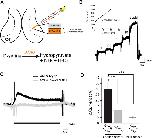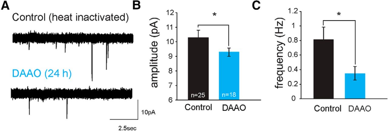 Reduced levels of d-serine lead to deficits in synaptic maturation. A, Example AMPAR mEPSC traces recorded from neurons in a control (top) and an animal injected intraventricularly with RgDAAO 24 h before recording (bottom). Average AMPAR mEPSC amplitudes (B) and (C) frequencies are reduced in animals treated with RgDAAO (blue), recorded 24 h after RgDAAO injection. Control animals were injected with heat-inactivated RgDAAO. *p < 0.05 (Mann–Whitney test).
