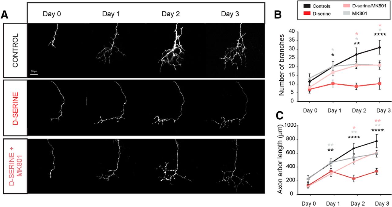 D-Serine results in reduced growth and branching of axonal arbors. Daily in vivo imaging of individual retinotectal axon arbors in animals electroporated to express EGFP in RGCs. Repeated imaging over 3 d of exposure to rearing solution containing d-serine (100 μm) and/or the NMDAR antagonist MK-801 (10 μm). A, Individual examples show greatly reduced growth and branching of d-serine-treated axons, which is rescued by NMDAR blockade. B, Number of branch tips and (C) total axonal arbor length for control tadpoles (n = 7), tadpoles raised in d-serine (n = 6), MK-801 (n = 5), and d-serine + MK-801 (n = 7). *p < 0.05, d-serine-treated versus other groups (two-way repeated-measures ANOVA with HolmâSidak post hoc test). ***p < 0.005, d-serine-treated versus all other groups (two-way repeated-measures ANOVA with HolmâSidak post hoc test). ****p < 0.0001, d-serine-treated versus all other groups (two-way repeated-measures ANOVA with HolmâSidak post hoc test). Black asterisk versus control. Gray asterisk versus MK-801. Pink asterisk versus d-serine + MK-801.